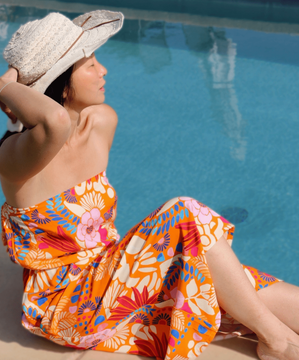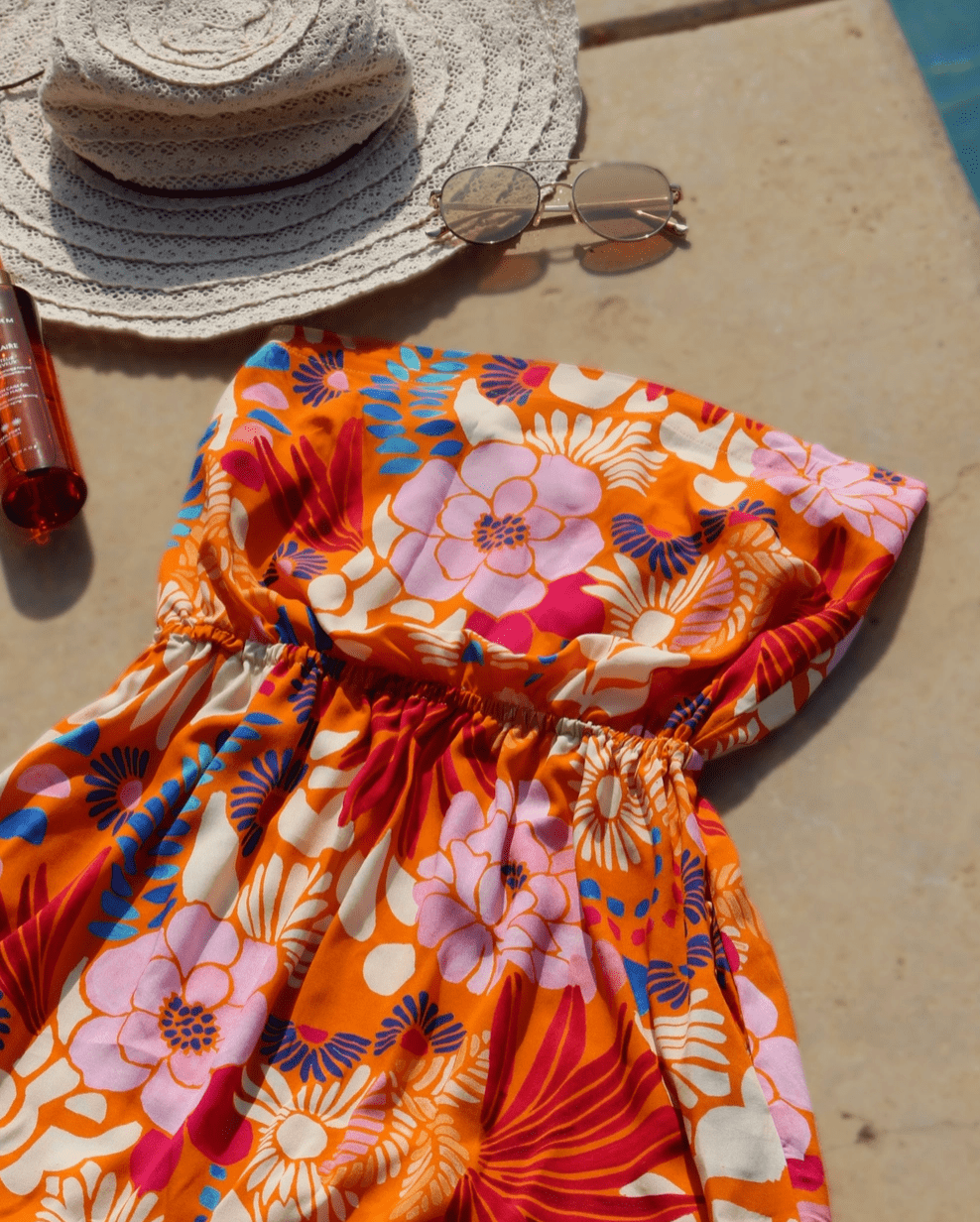 MOOREA captures the warmth of summer in a Polynesian-inspired floral pattern. Its lush blooms and luminous shades of orange, yellow, and pink evoke a sunset over the Pacific lagoons, an invitation to escape and lightness.