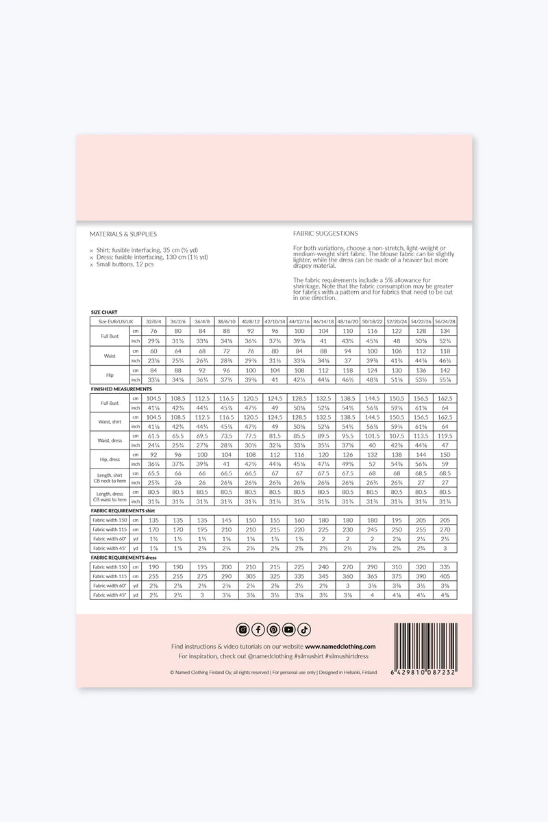 Silmu is a stylish sewing pattern duo that includes a loose-fitting shirt and a midi-length shirt dress. Both variations feature a distinctive overlapping collar. The shirt variation also includes breast pockets, a back pleat, long sleeves with cuffs, and an uneven hem with side slits. The waist pleats of the dress variation make it loose at the top, while the skirt is lightly fitted. The dress also has pleated half sleeves and a tie closure at the back.