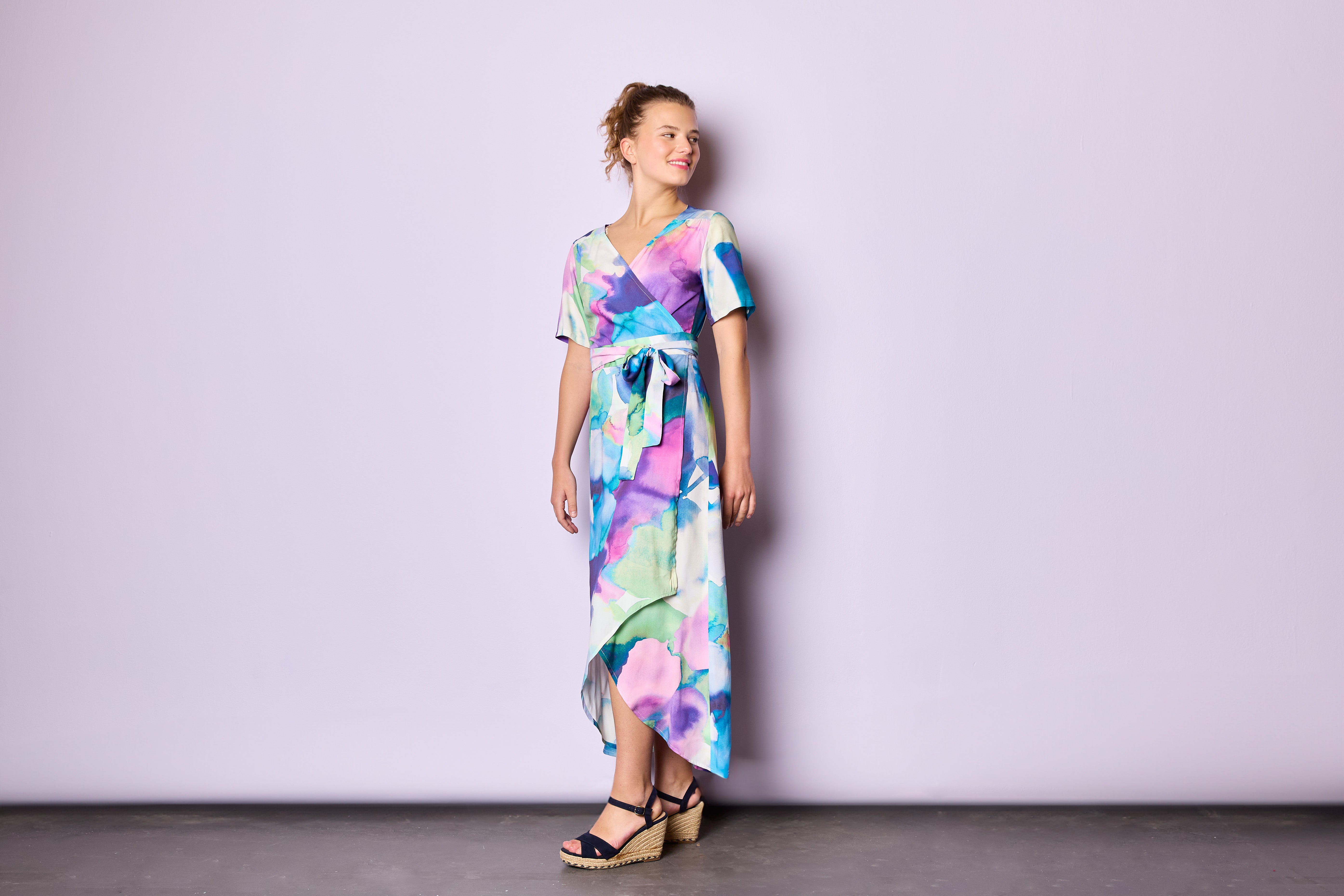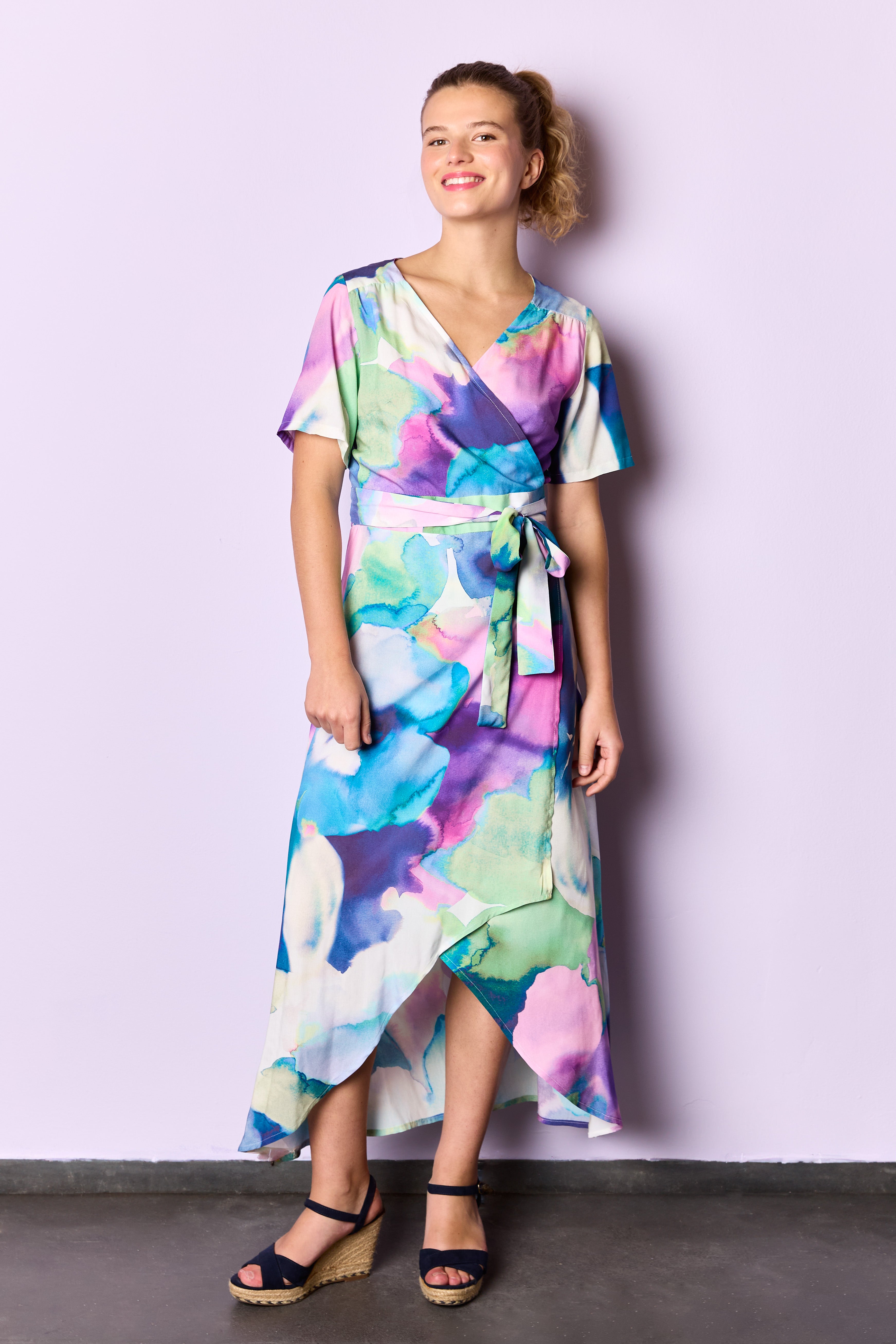 A soft coloured aquarel viscose with colours of pink, green and blue. This fabric is perfect for blouses, dresses, skirts...
