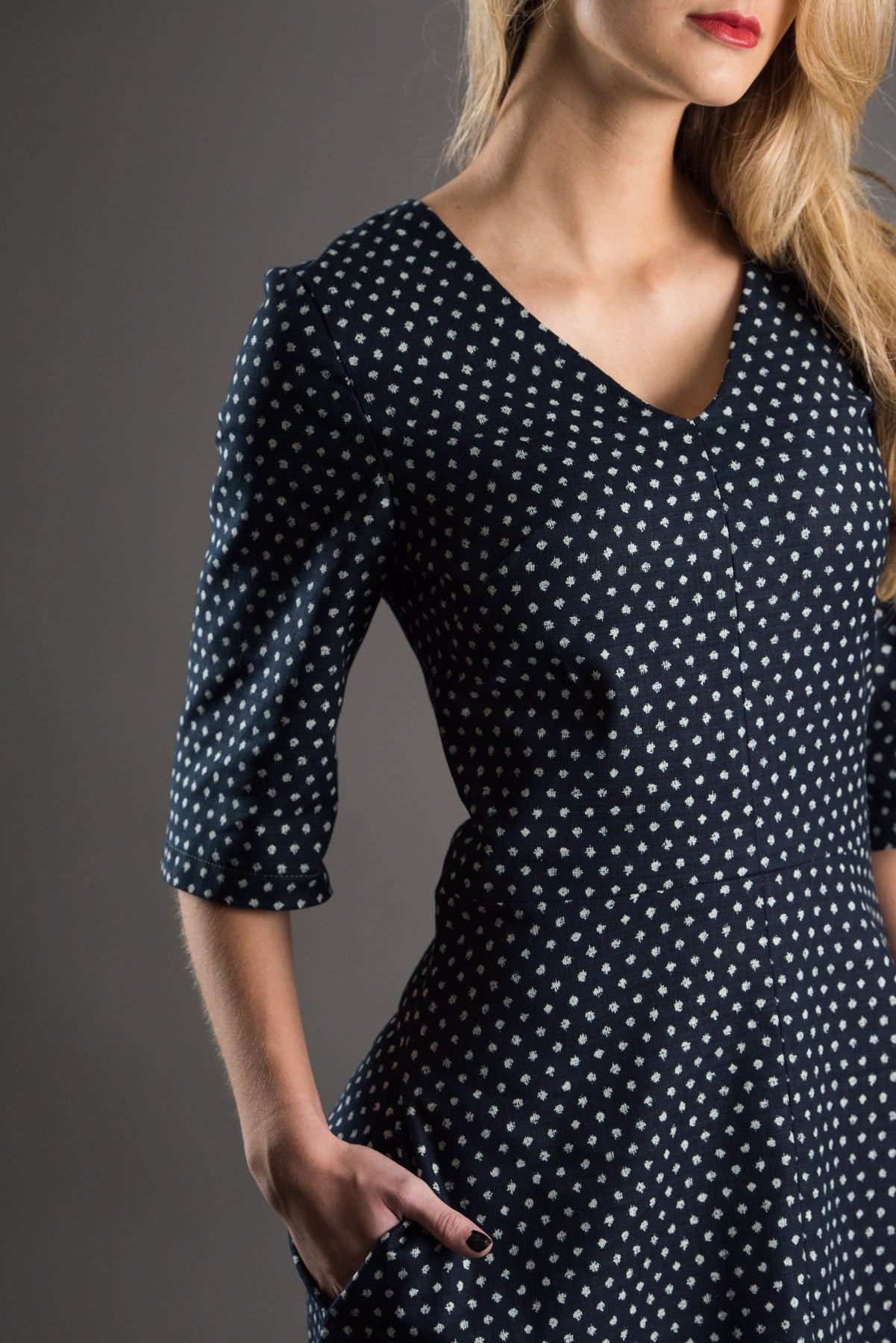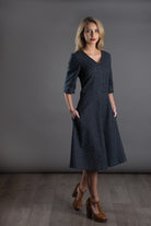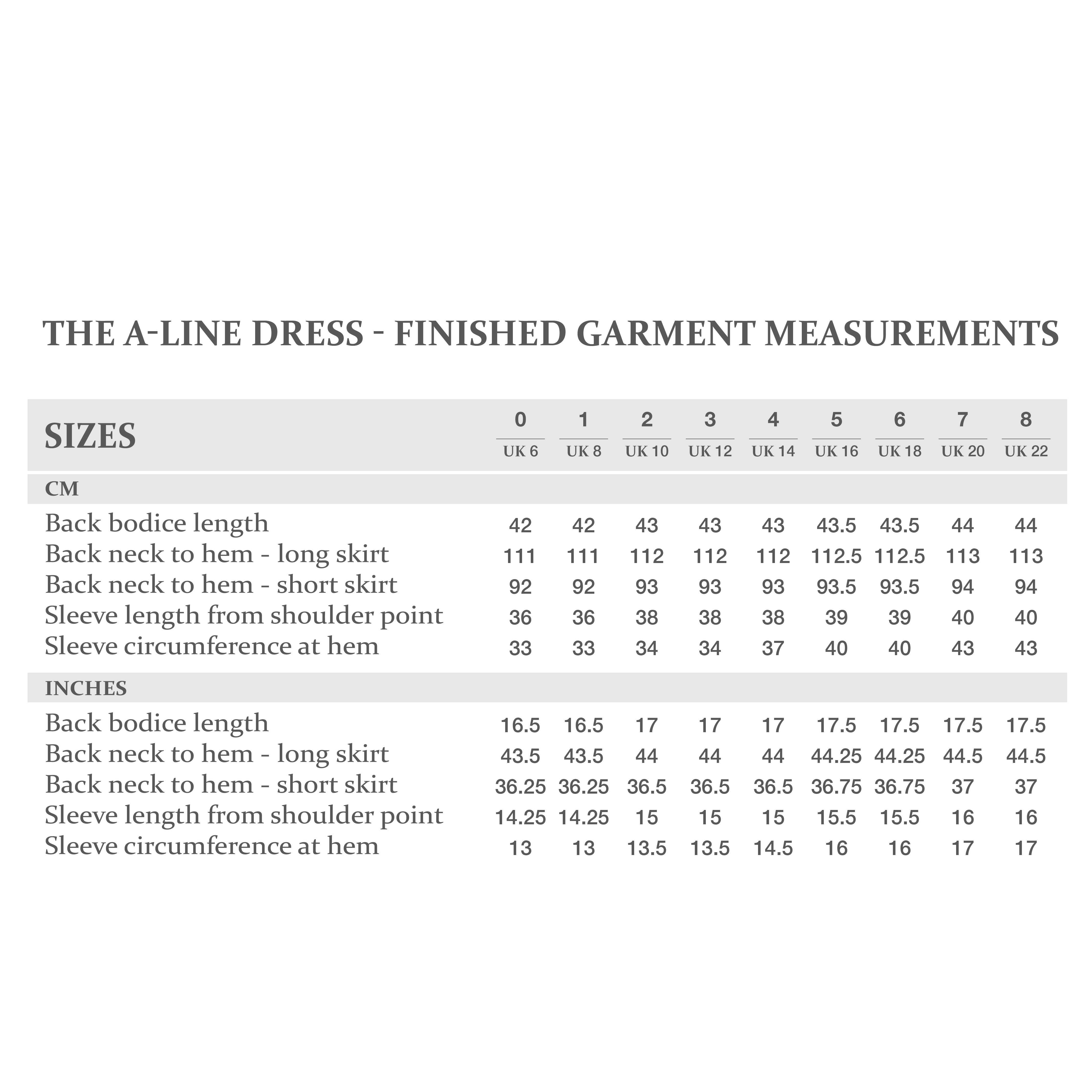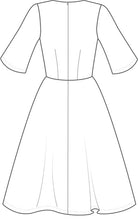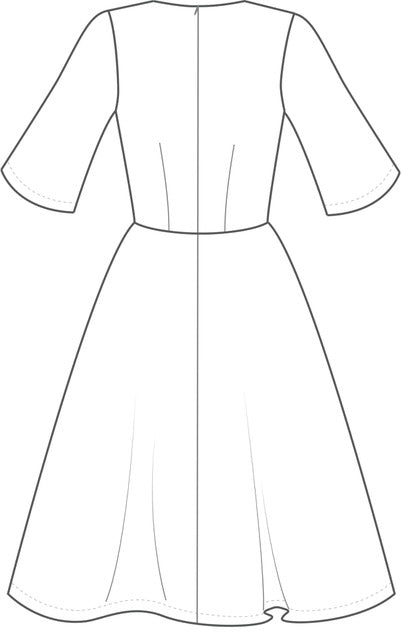 This stunning A-line dress creates a classically flattering silhouette. Featuring a fitted bodice, loose sleeves and sophisticated V-neckline, this garment will add timeless elegance to any wardrobe. Zipper at back. Optional inner pockets and short/long skirt variations included. Cover image in long skirt version.