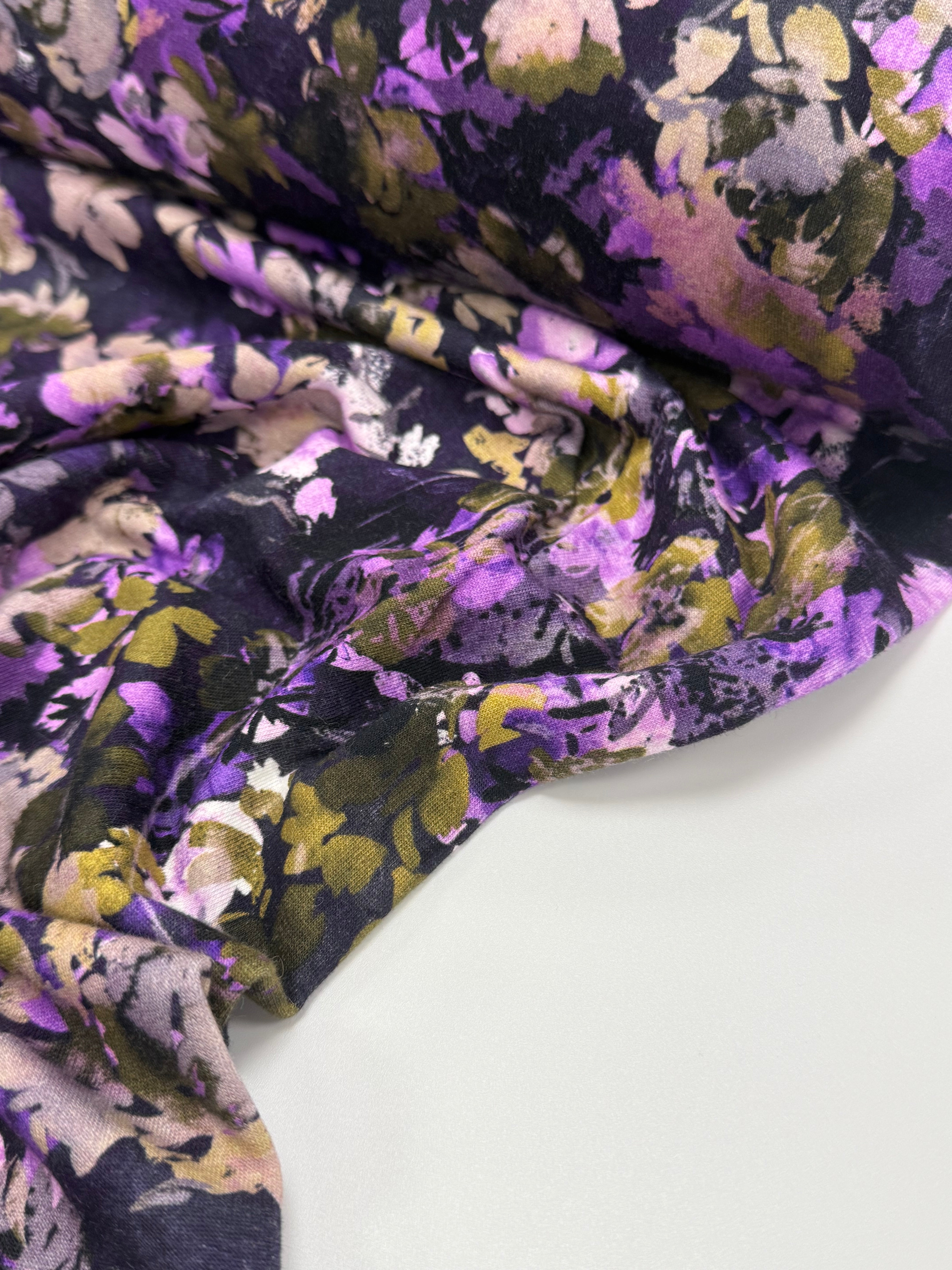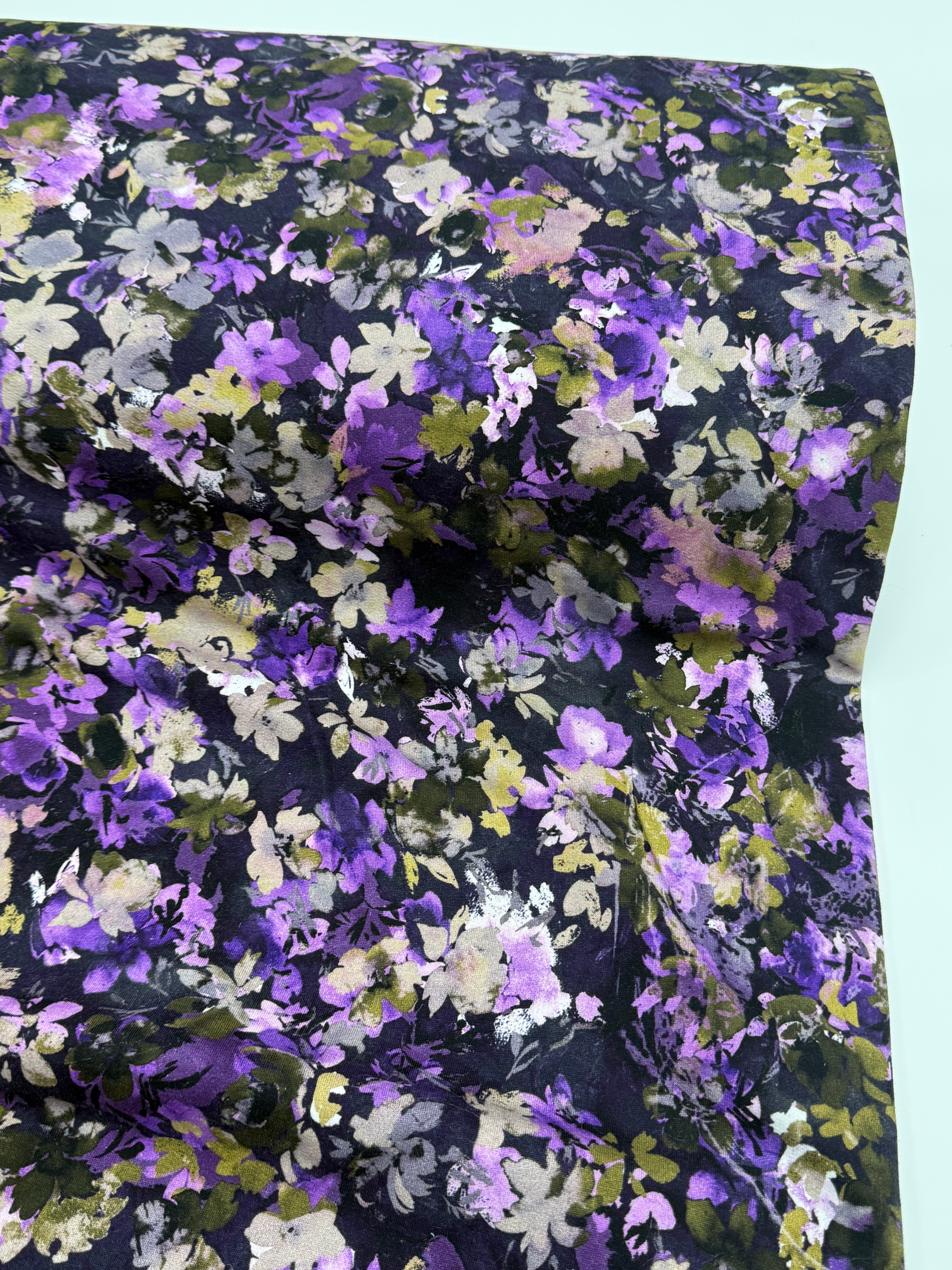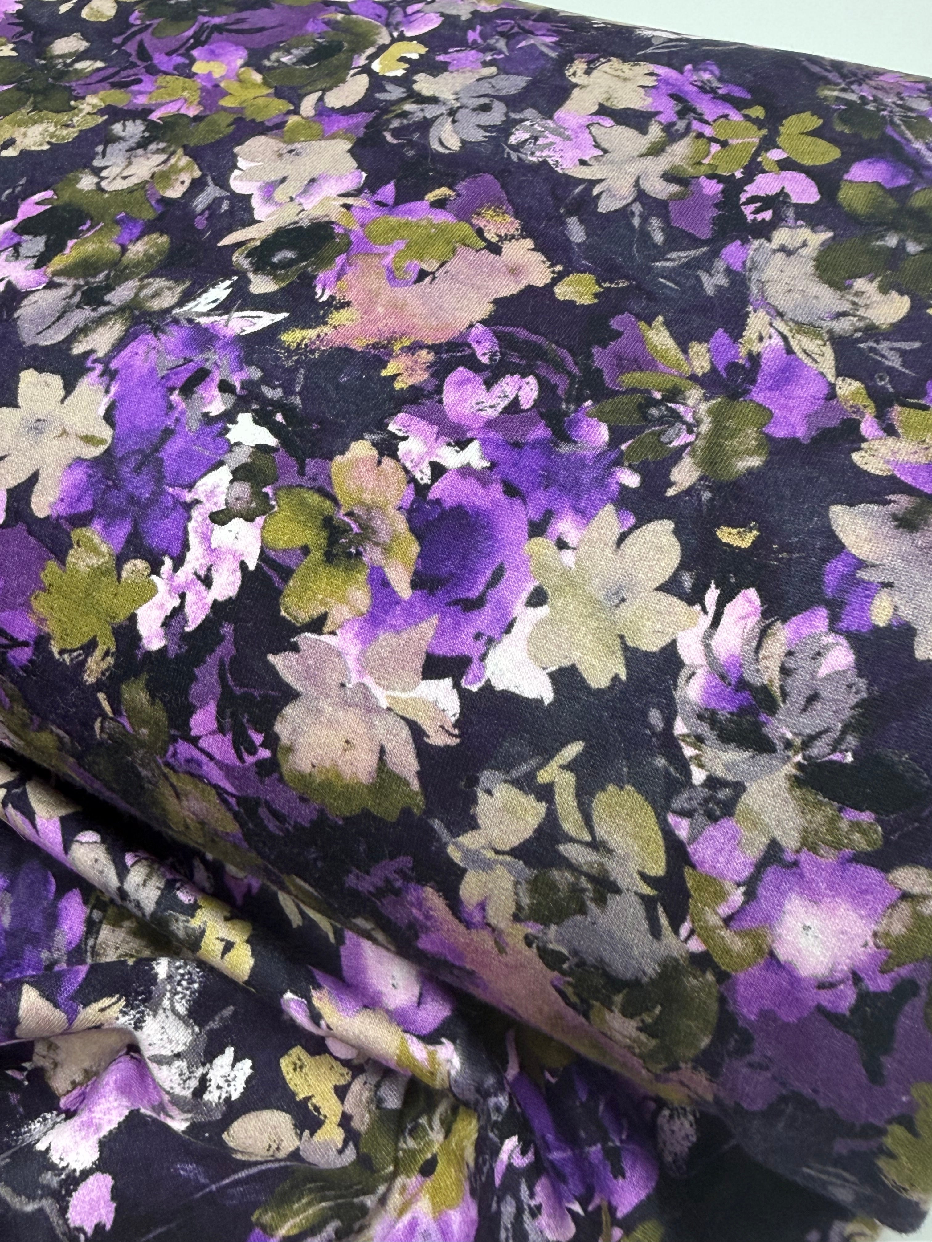 Twilight Bloom is a beautifully soft sweatshirting fabric featuring an digital abstract floral print in rich shades of violet, olive, and blush against a deep charcoal background. The painterly design and gentle colour palette make it perfect for creating elegant, comfortable pieces with a touch of drama.