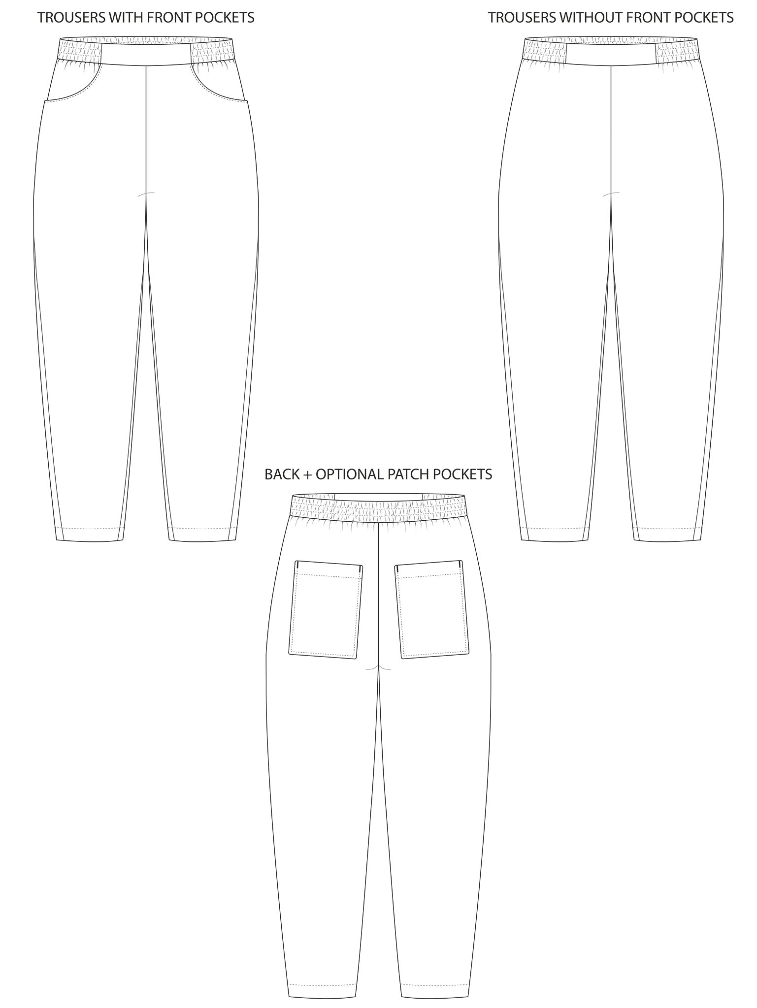 - Optional pockets in two styles: Curved opening at the front and/or large rectangular patch pockets at the back