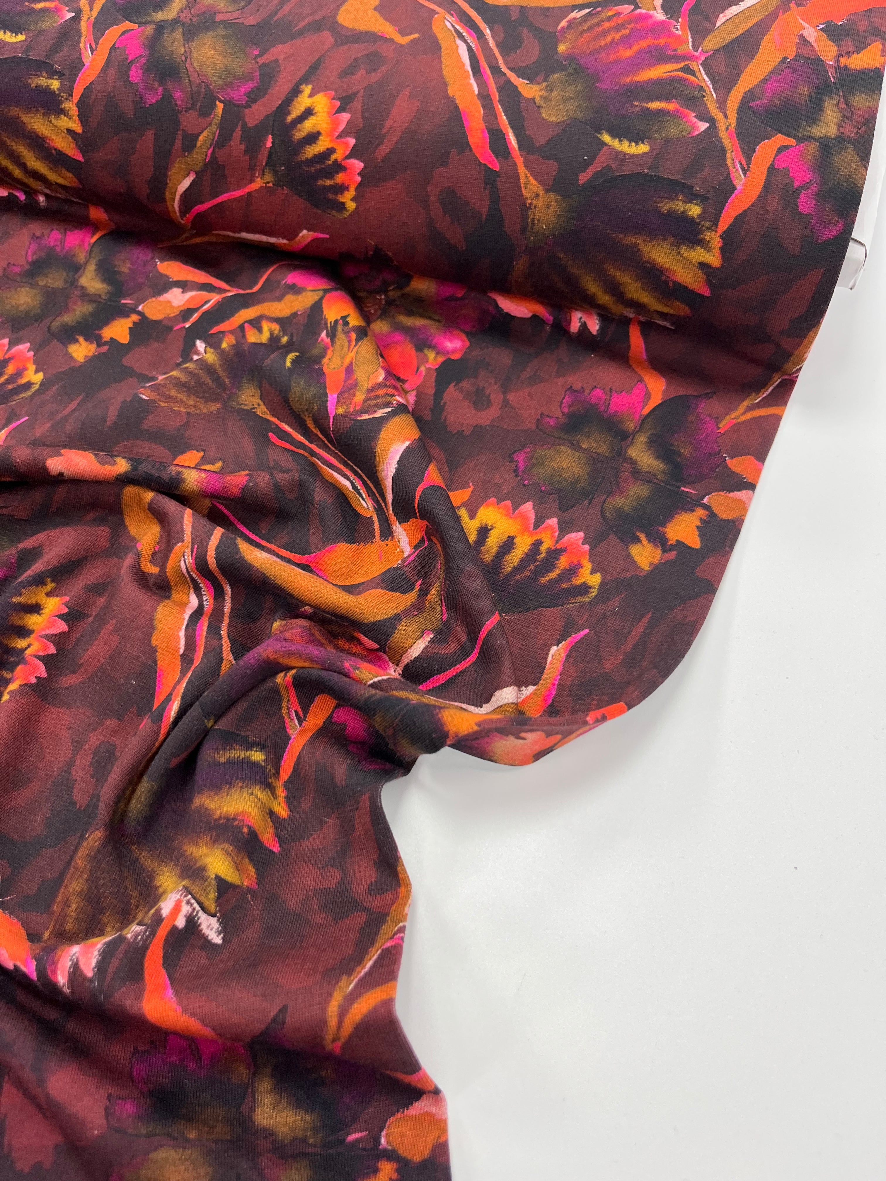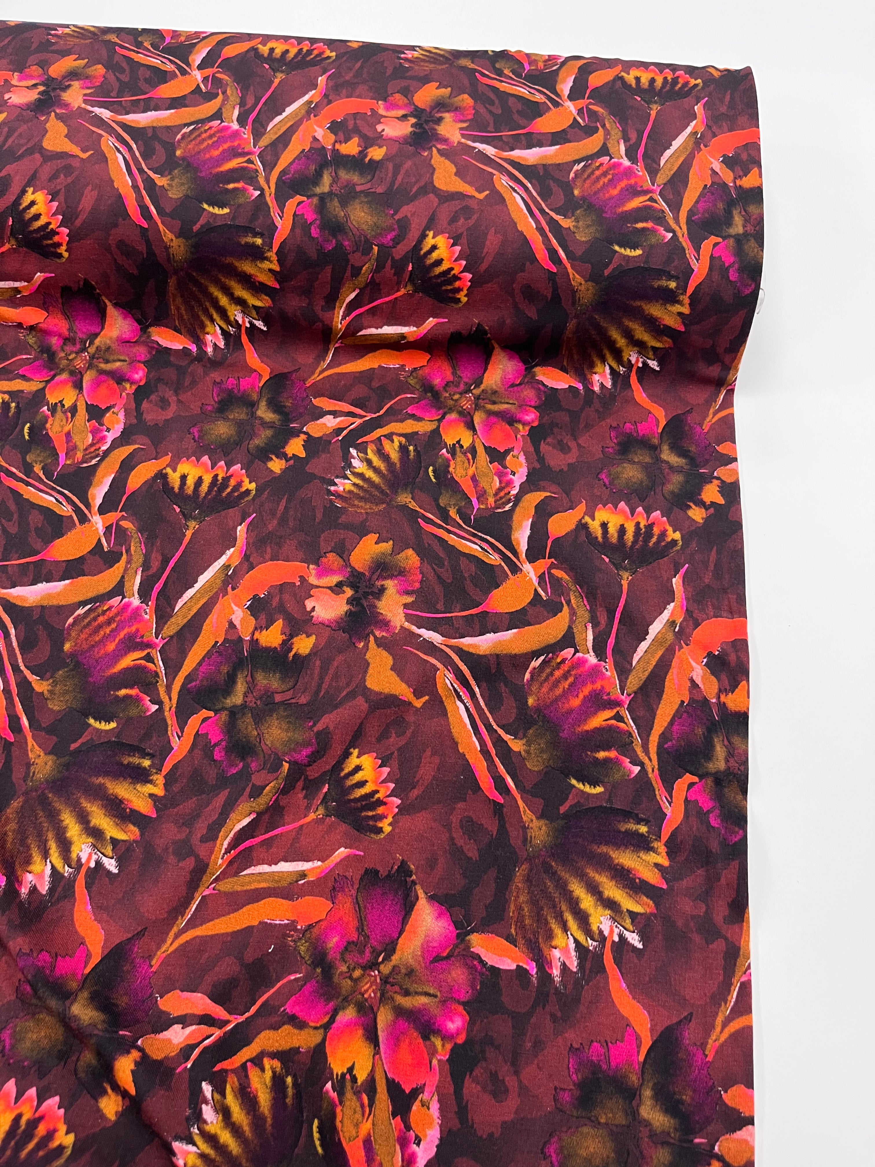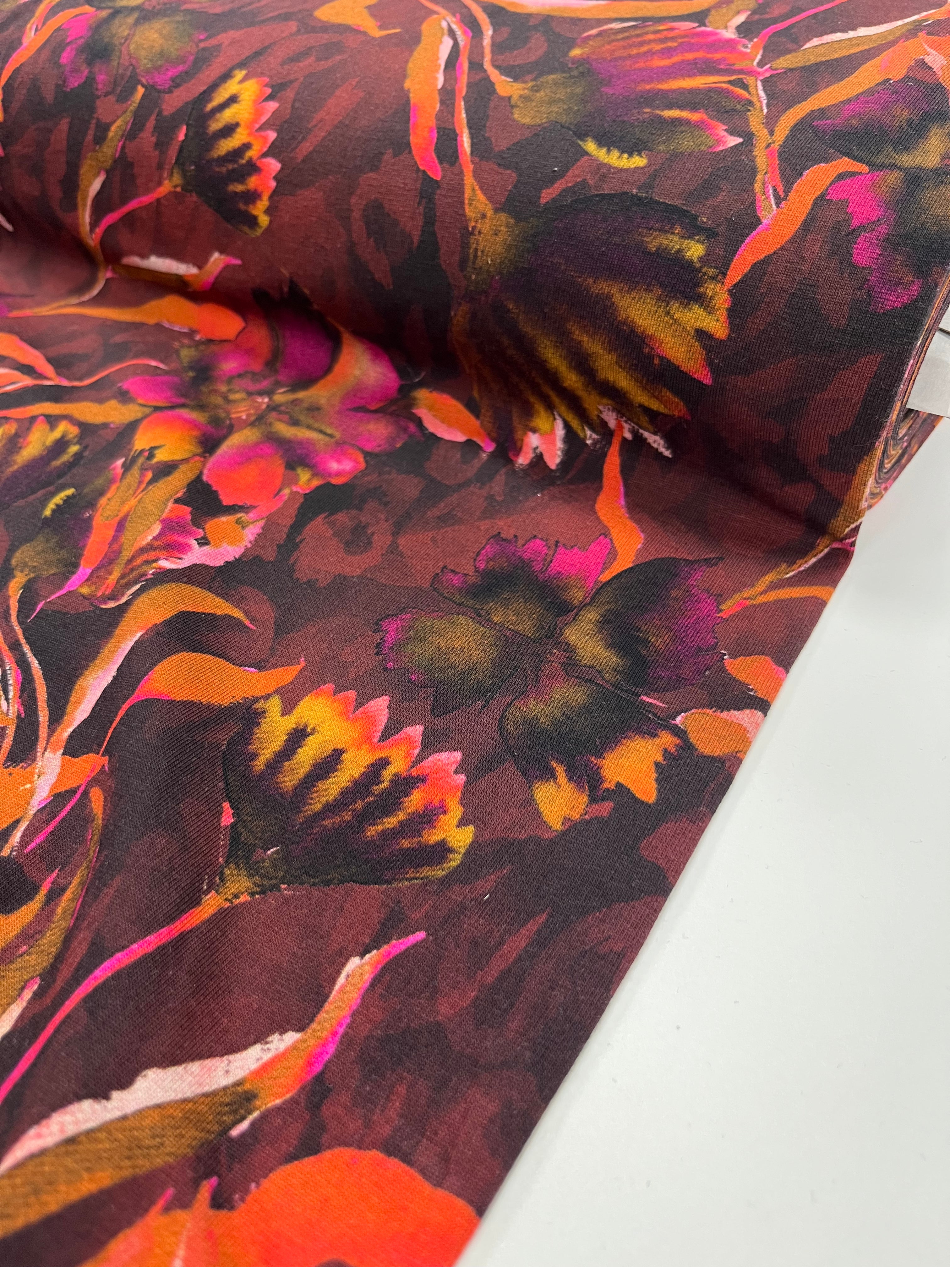 Wrap yourself in cozy charm with Sundown Cotton Jersey. This soft, breathable fabric is perfect for making tops , wrap dresses and sweaters that keep you comfy and stylish. Its dark, moody background sets off large, bold floral prints—bringing a playful yet sophisticated vibe to your wardrobe creations. Whether you’re sewing for chill days or cool nights, this fabric adds a touch of drama and delight.