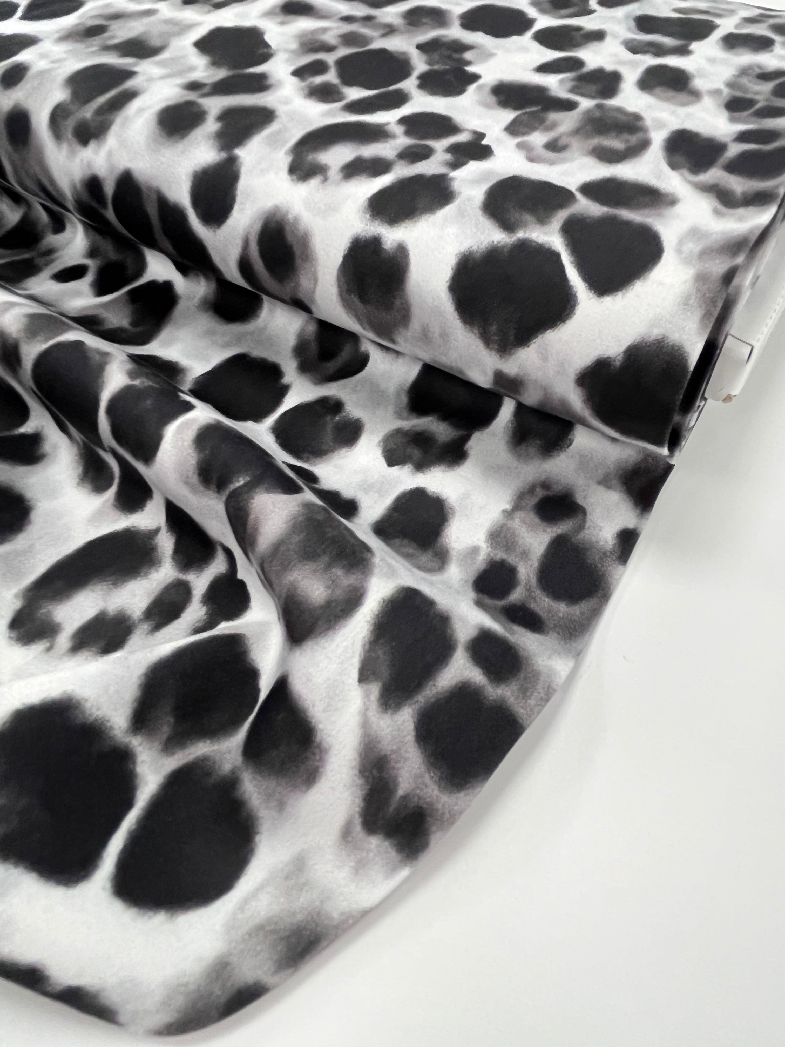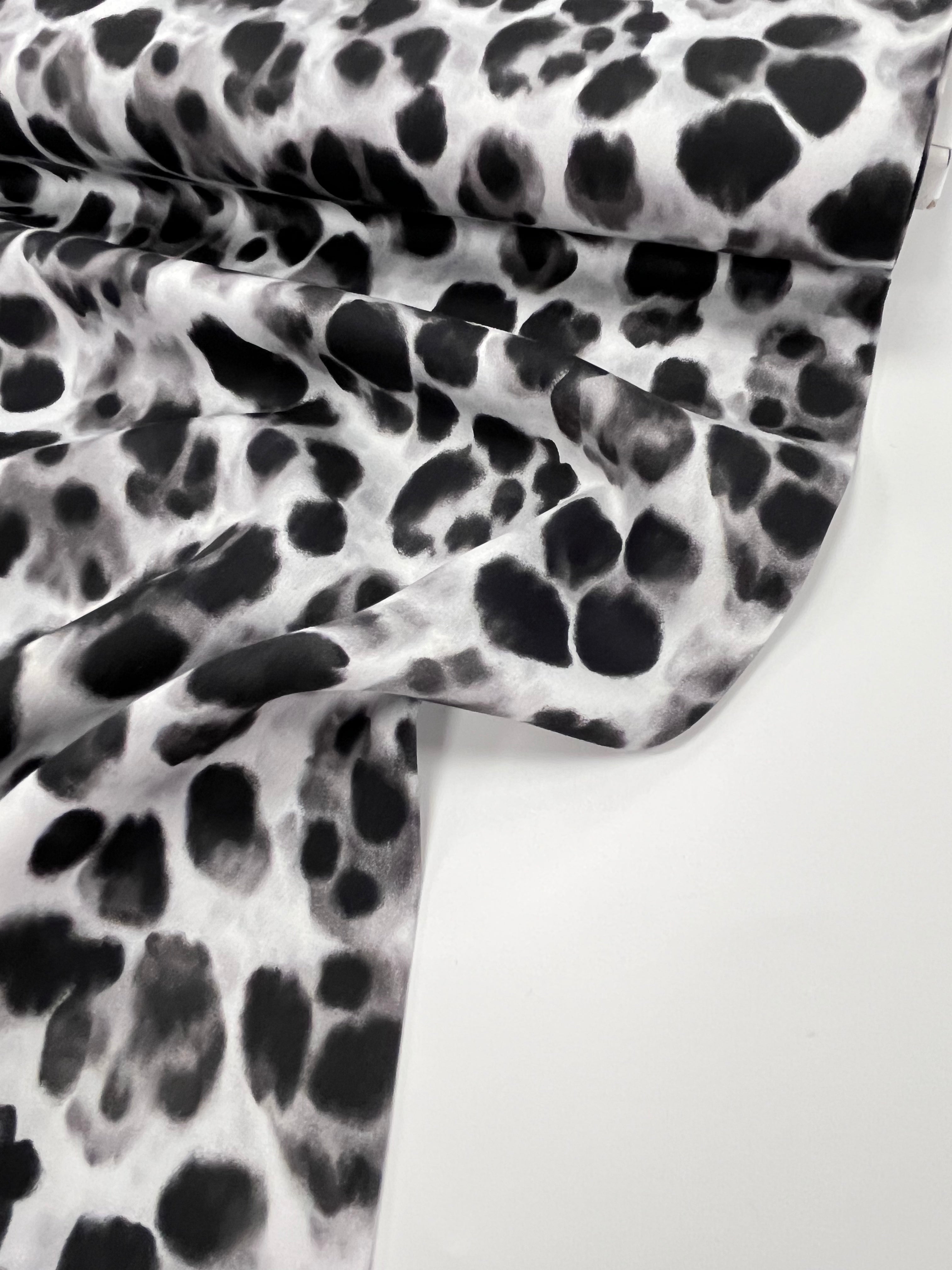 The abstract animal-inspired design brings a modern twist to this fabric, with painterly spots available in two versatile colourways — Black or Ecru. With its matte finish, Eclipse has all the softness of satin without the shine, giving your handmade garments a refined, contemporary look.