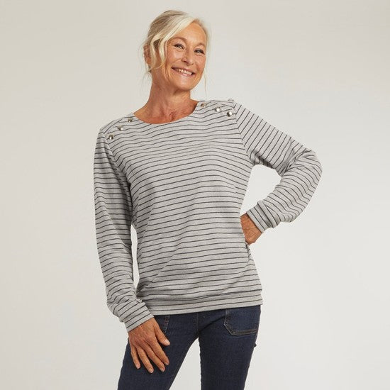 Ellie is a modern take on the classic sweatshirt, adding a feminine twist with 6 decorative buttons placed on the shoulders. With a round neckline, ribbed cuffs, and hem, it blends comfort and style effortlessly.