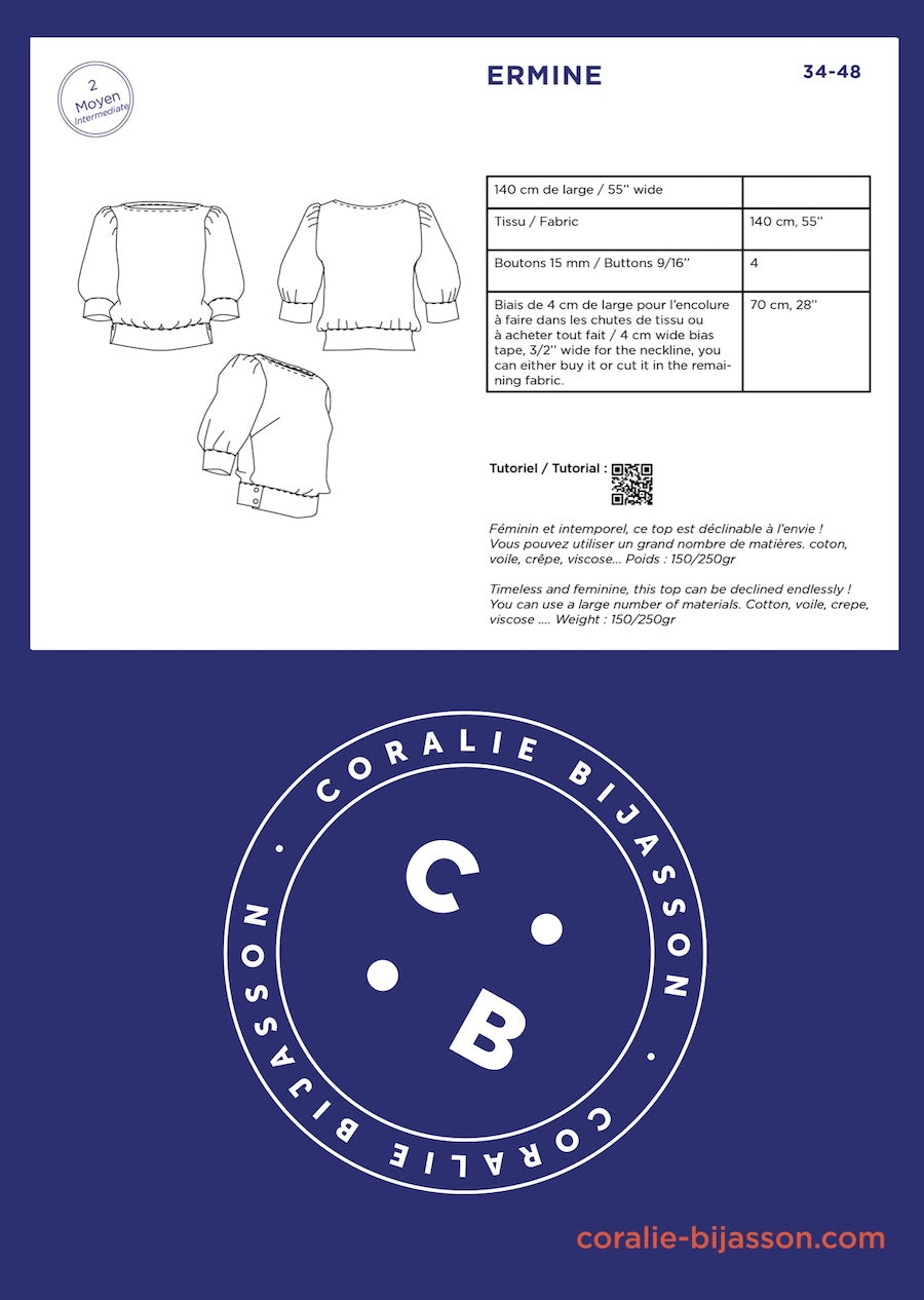 Discover the Ermine sewing pattern: an elegant, feminine, and trendy blouse designed to accommodate all sizes, from 34 to 48.