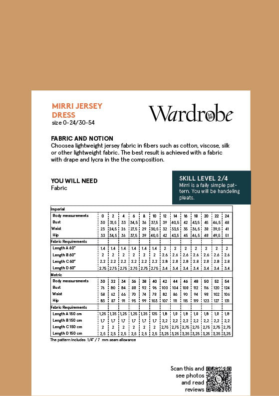 Mirri faux wrap dress sewing pattern is a body-hugging faux wrap dress with a shawl-like classic collar that creates a modest V neckline. The skirt is fitted through the high hip area and flared at the hem. Choose your length from Blouse to maxi. This pattern is for jersey fabric.