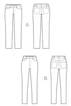 View A features a low rise, straight "stovepipe" leg and traditional fold-over front pockets. View B has a high rise, skinny leg and pocket stay sewn into center front.