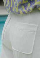 Borrowing from classic menswear, it features welt pockets at the front and a crisp pleat down the leg, while the back showcases two patch pockets adorned with a signature swallow-shaped detail. The waistband sits neatly at the natural waist.