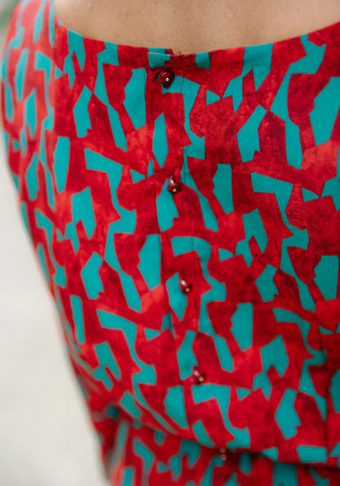 The technical points of the pattern are: sewing darts and pleats, sewing rounded necklines with a neat finish, making a sheath construction for impeccable shoulder finishes, making a button placket, attaching elastic at the back and sewing an invisible side zip.