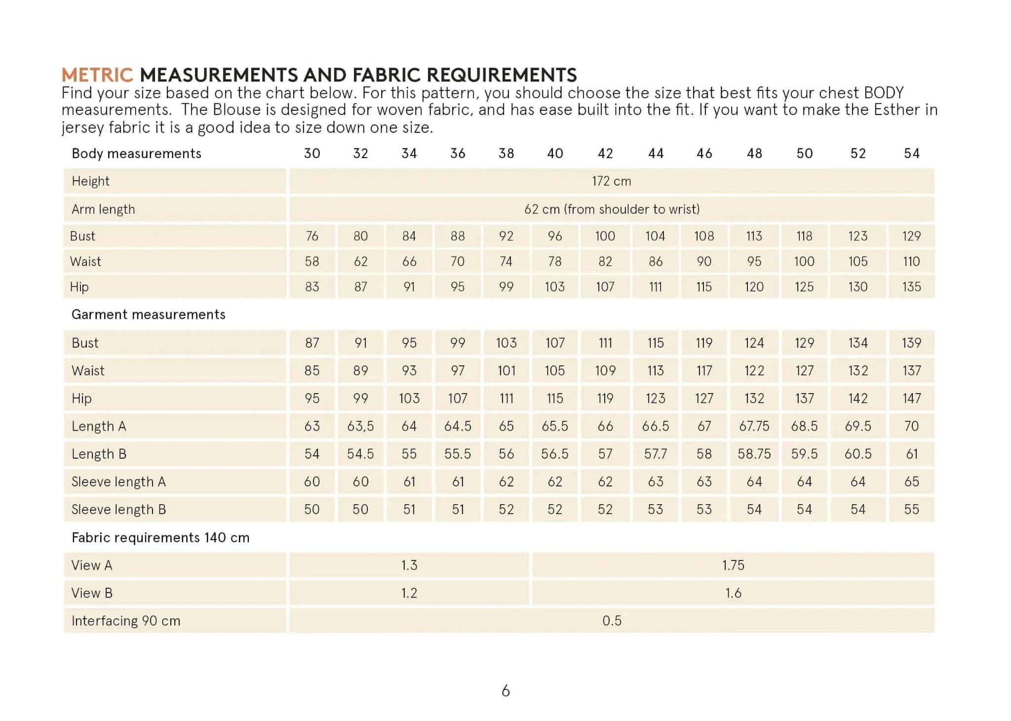 The model is 172 cm tall and wearing the Esther blouse in size 8/38. Flip through the images to find the measurement charts and fabric requirements.