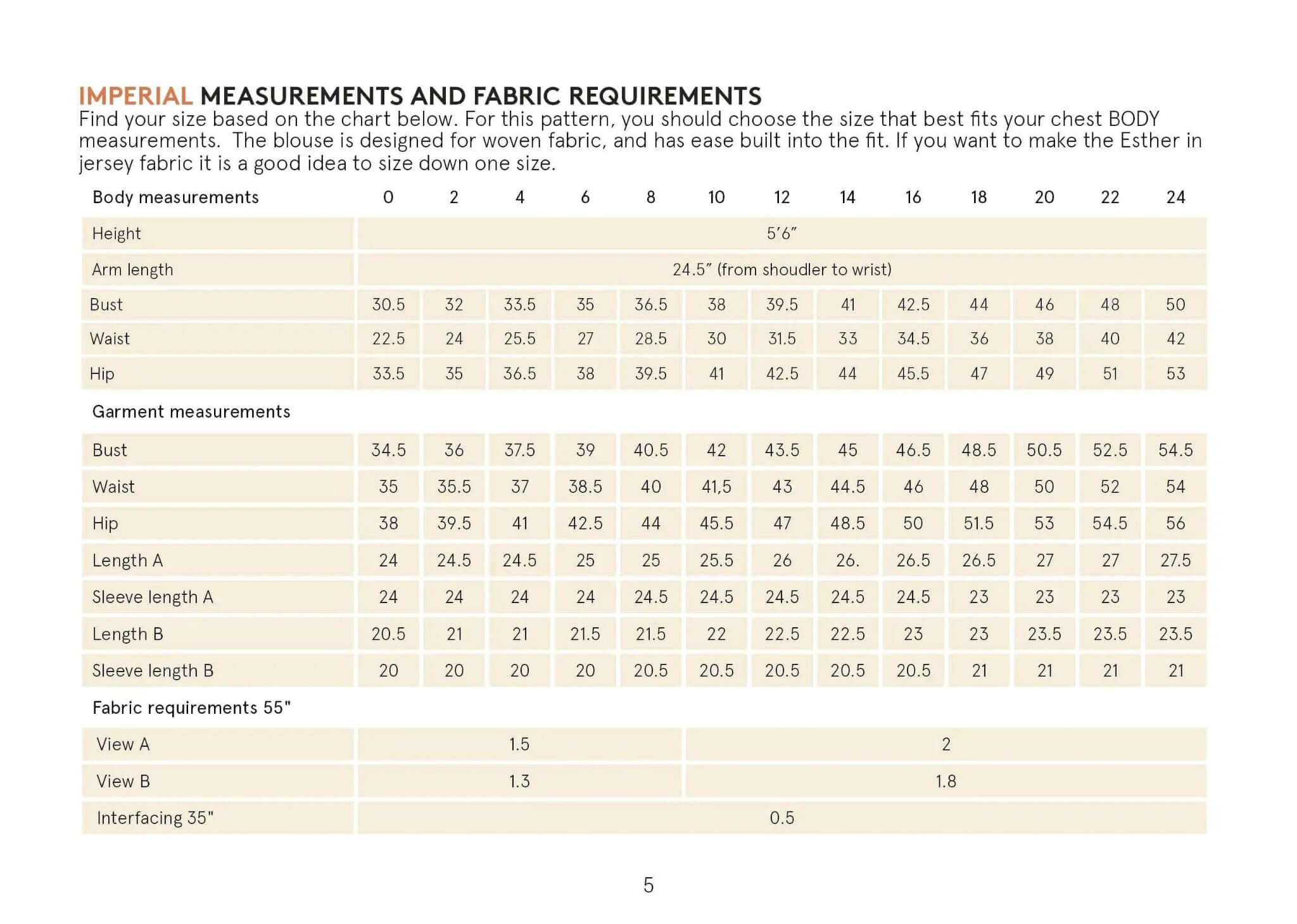 Flip through the images to find fabric requirements and measurements for the Esther Blouse sewing pattern.