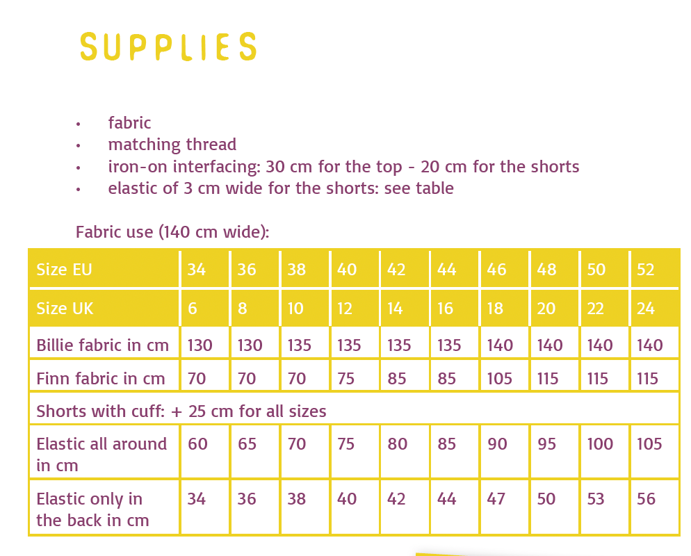 In the mood for summer and looking for a fun and easy sewing project? May we present you Billie and Finn! This pattern includes a top and shorts perfect for sunny days or your well deserved holiday in the sun! Billie is a fun, loose top with a V-shaped neckline. The short, grown-on sleeves are finished with a large cuff. Finn shorts has topstitched pockets and an elastic in the waistband. You can also just pull the elastic through the back, so the front waistband stays nicely flat. You can add a trim at the hem for a more dressed look, but you can make Finn just as well without all the extras for a fast and super easy project!This is a paper pattern, the pattern includes a hardcopy of the pattern sheet and sewing instructions. The pattern pieces on the pattern sheet are overlapping and printed recto-verso. The pattern is in English, Dutch and French.