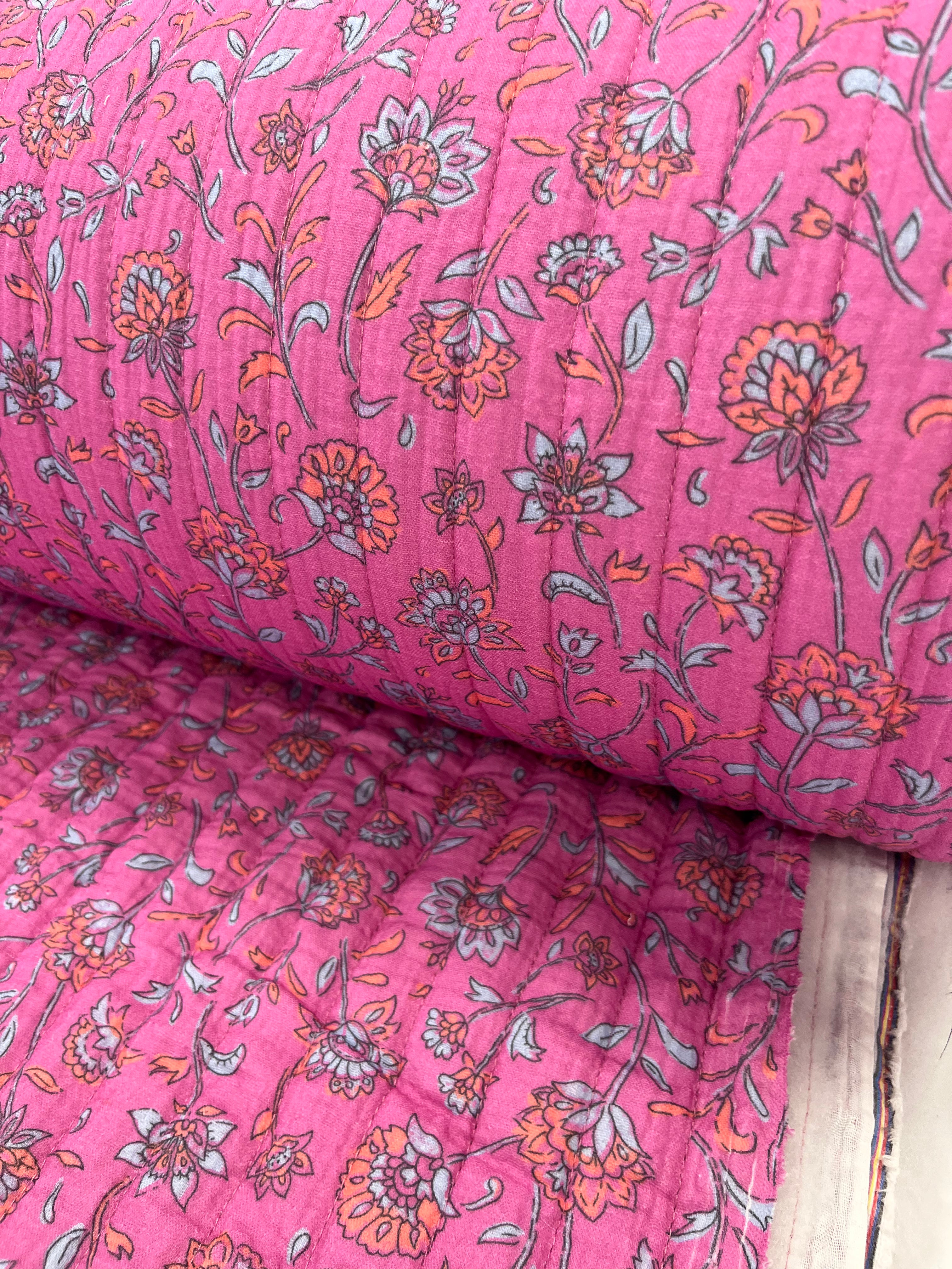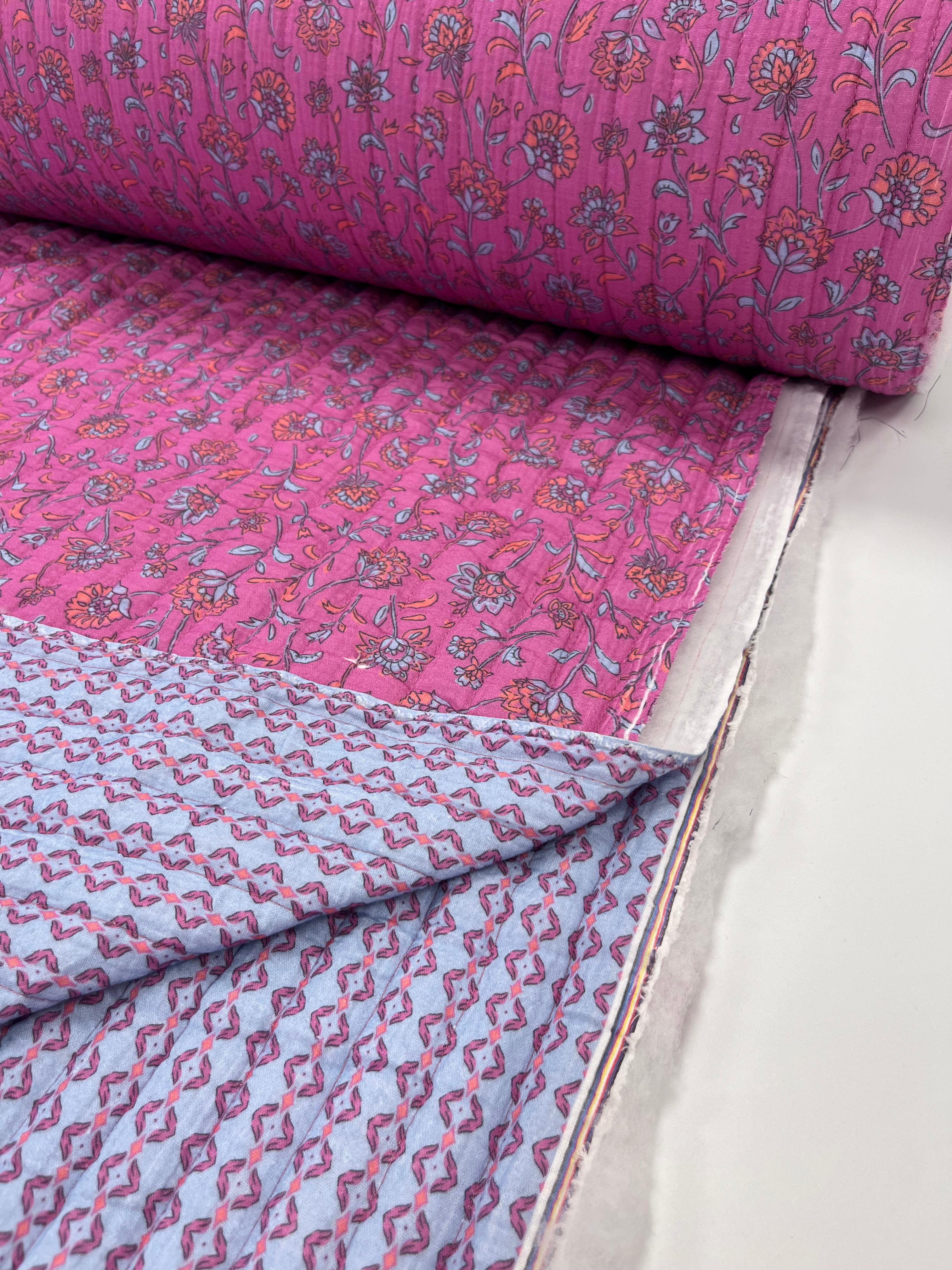 This beautiful quilted cotton fabric is double sided. It would be fab as a reversible gilet or jacket for summer with a bias bound edge.