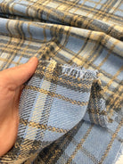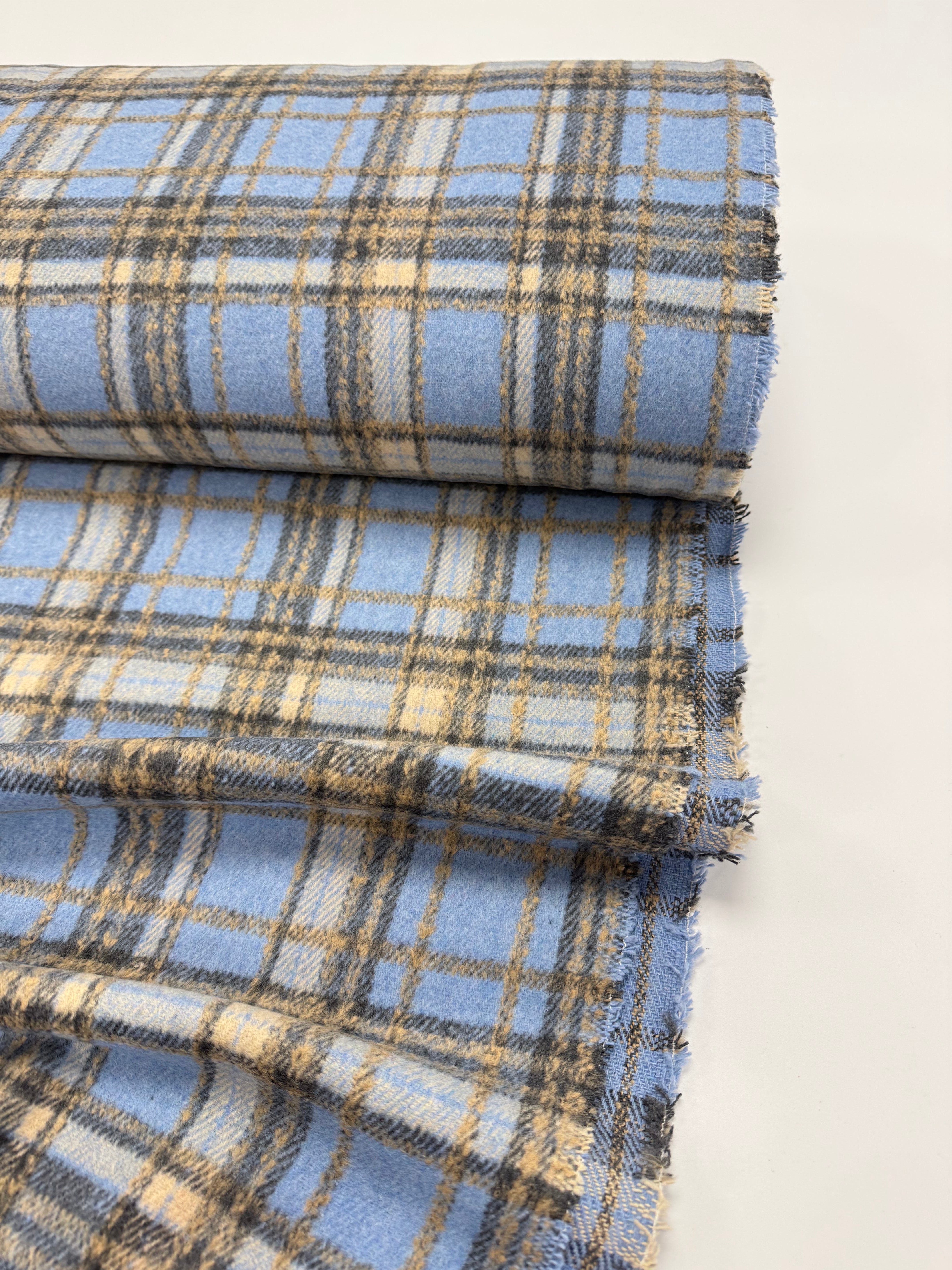 A brushed check in powder blue, camel, and charcoal grey. Soft and fluffy with a warm handle, ideal for coats, shackets, and winter dresses.