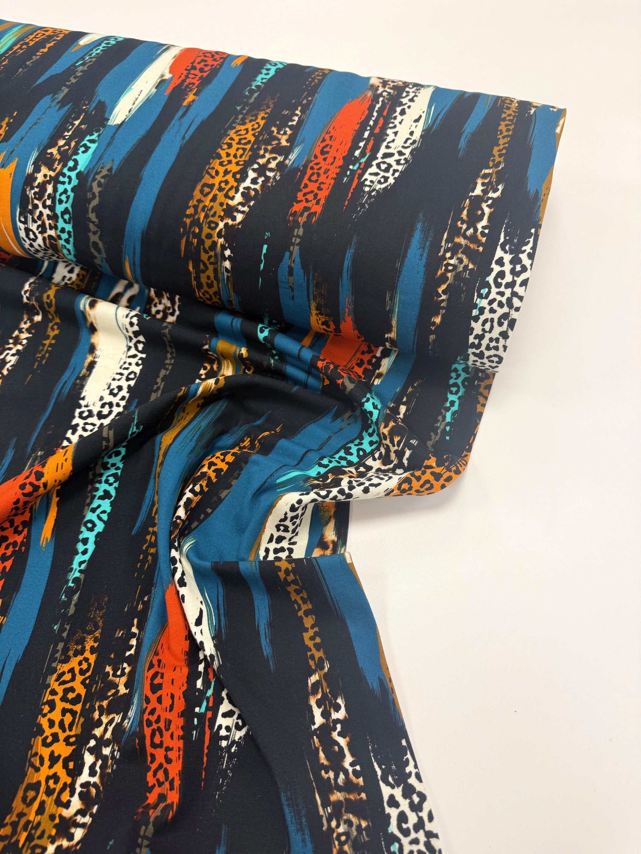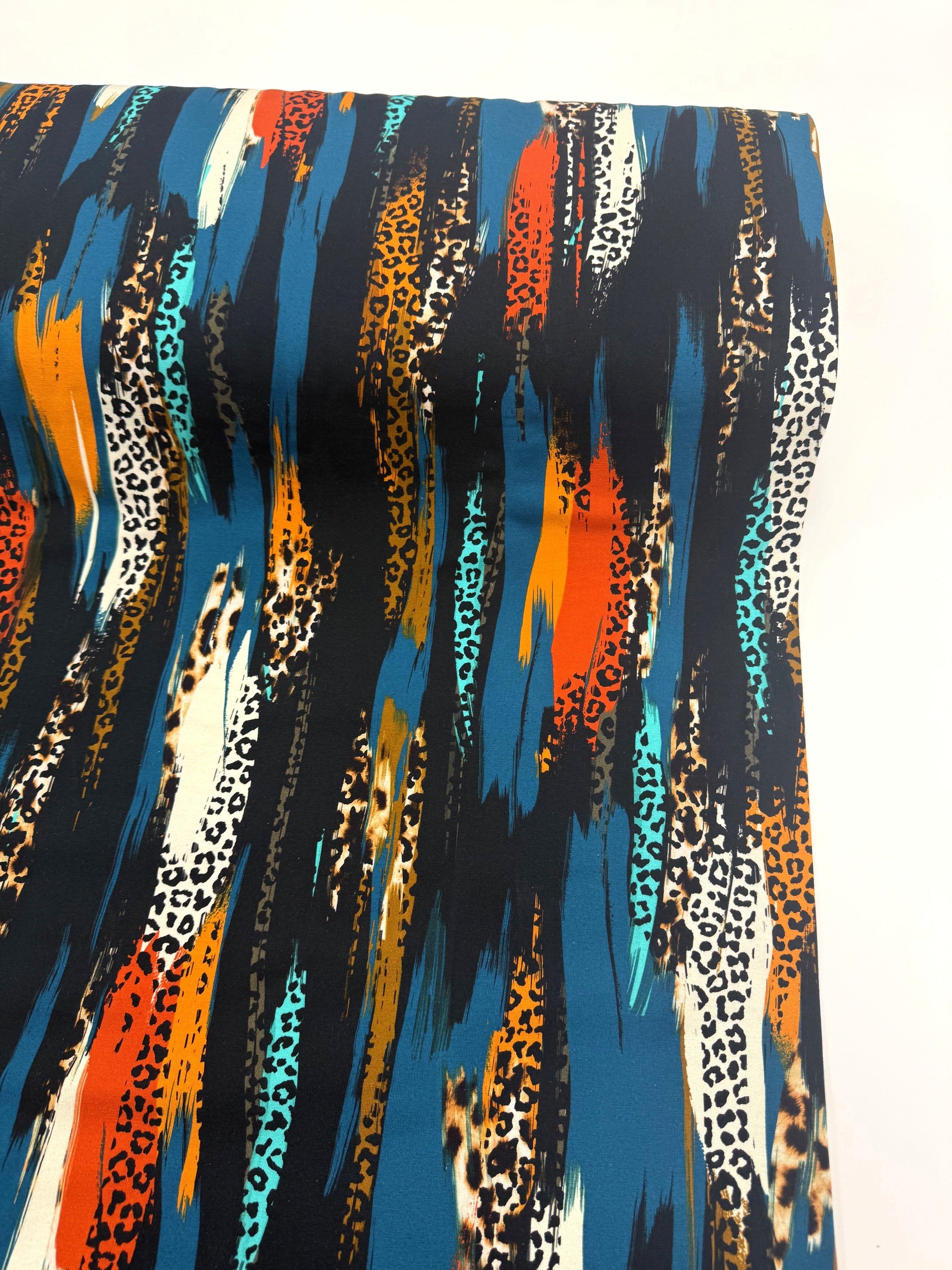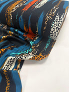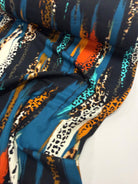A dynamic collision of colour and texture, Savannah Brushstrokes blends painterly stripes with subtle animal-print accents. Rich teal, amber, ivory and flashes of burnt orange sweep across a deep black base, creating a sense of movement and bold energy. This is a statement print with a sophisticated wildness—perfect for adding drama and confidence to any handmade wardrobe.