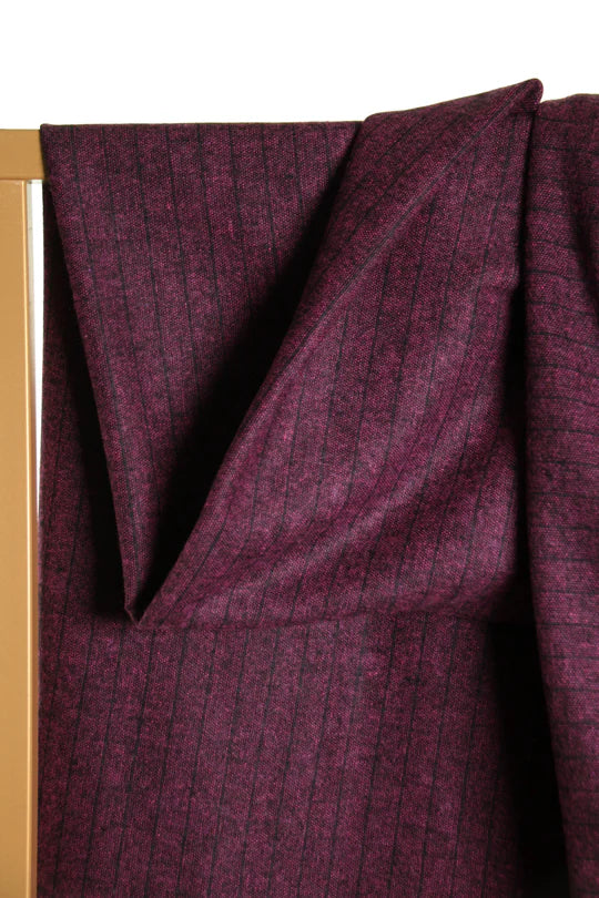 A mid-weight wool-polyester mix in a deep fuchsia colour with fine black lines. Perfect for skirts, blazers, jackets...