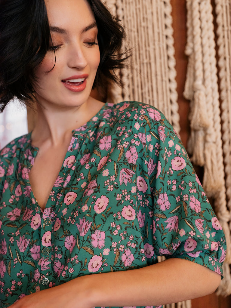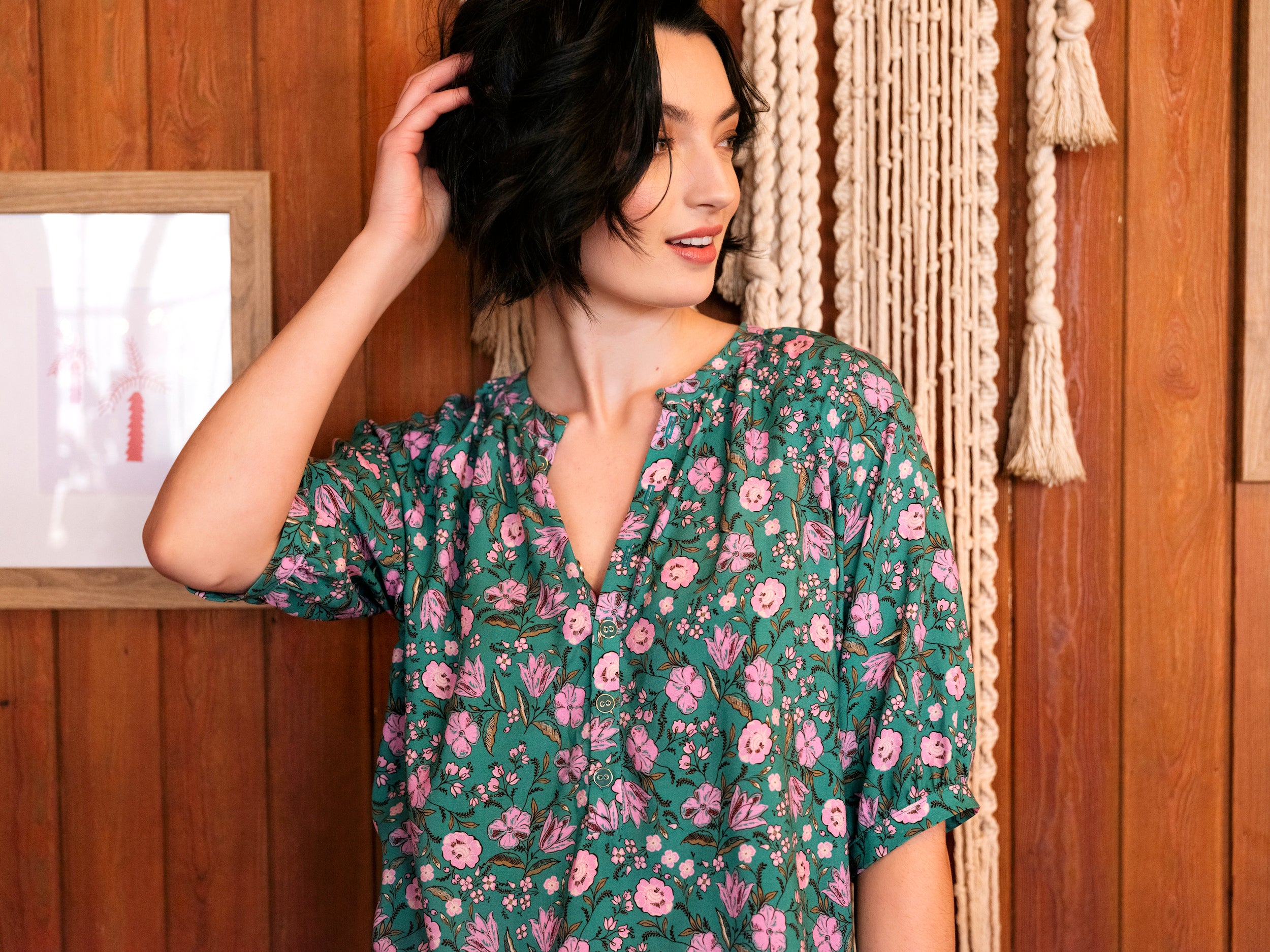 We're so happy with this new pattern for a lovely blouse with raglan sleeves and elegant popover placket! Olivia has medium length sleeves, a nice gather at the collar and a slightly rounded hem. Or maybe you prefer making the dress? They are both included in this double pattern!