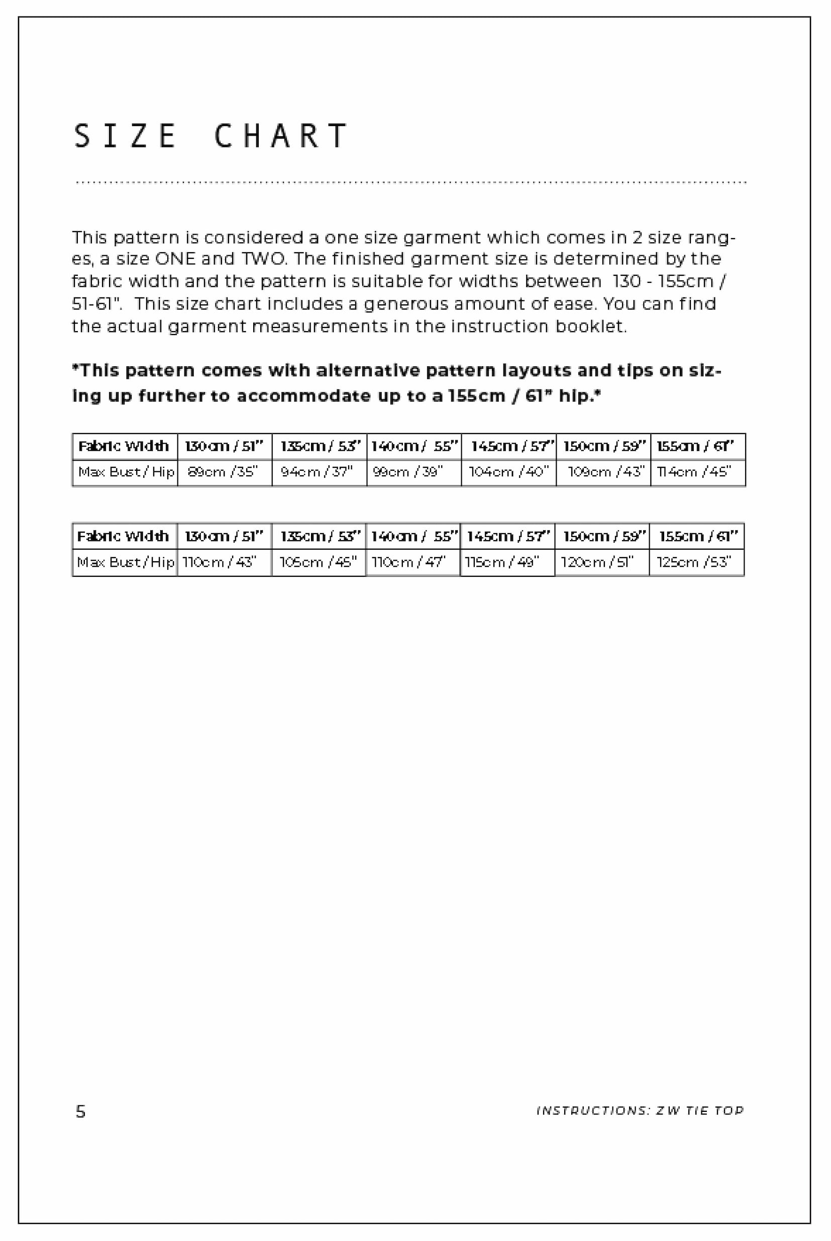 The finished width of this garment is determined by the fabric width you use. There are 2 size options for this top, a size ONE and TWO with a maximum hip size of 125cm / 53". The pattern also includes additional instructions to size up further to a 155cm / 61" hip.