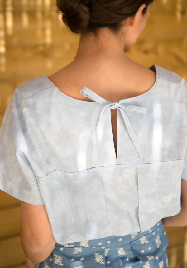 PALMA is the beginner's sewing pattern for your summer wardrobe! Simple, but always with a touch of Maison Fauve : the pretty pleated back with yoke, closed with pretty knotted ties. Its loose fit and scoop neckline make it ultra comfortable, as beautiful worn as a blouse or tucked into trousers.