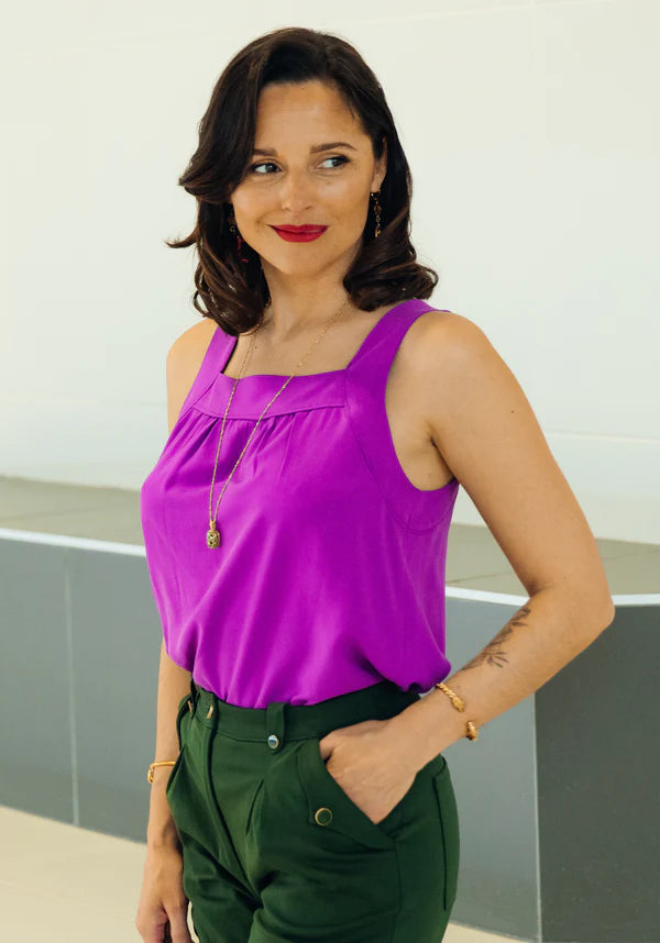 Like a desire for lightness, a little top with which everything is allowed. The SALTO top is a pattern that we like to decline in all materials, for all occasions. According to your desires, you can sew the buttoned front version or the full front version, which will allow you to play as much with the prints without difficulty of connections as with the beautiful materials and the pretty buttons. The perfect cleanliness of the wide straps assembly allows you to sew openwork fabrics without any visible facing.