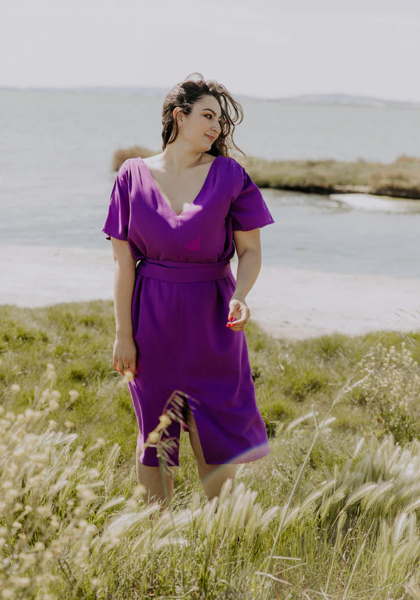 The TRANSAT dress is the perfect summer piece for lounging by the water. Easy and quick to sew, it does not lack charm. The bust is constructed with a nice pleat on the shoulders, the neckline is embellished by a front and back V neck (bra friendly!) and it has a nice slit in the middle front that brings sophistication to the piece. TRANSAT is very comfortable to wear with its smooth line and belted waistband.