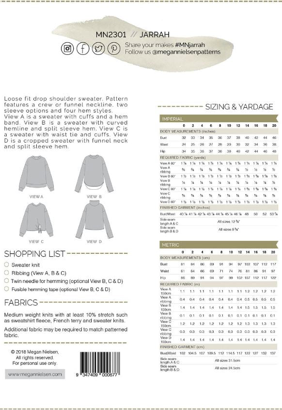 Loose fit drop shoulder sweater. Pattern features a crew or funnel neckline, two sleeve options and four hem styles. View A is a sweater with cuffs and a hem band. View B is a sweater with curved hemline and split sleeve hem. View C is a sweater with waist tie and cuffs. View D is a cropped sweater with funnel neck and split sleeve hem.