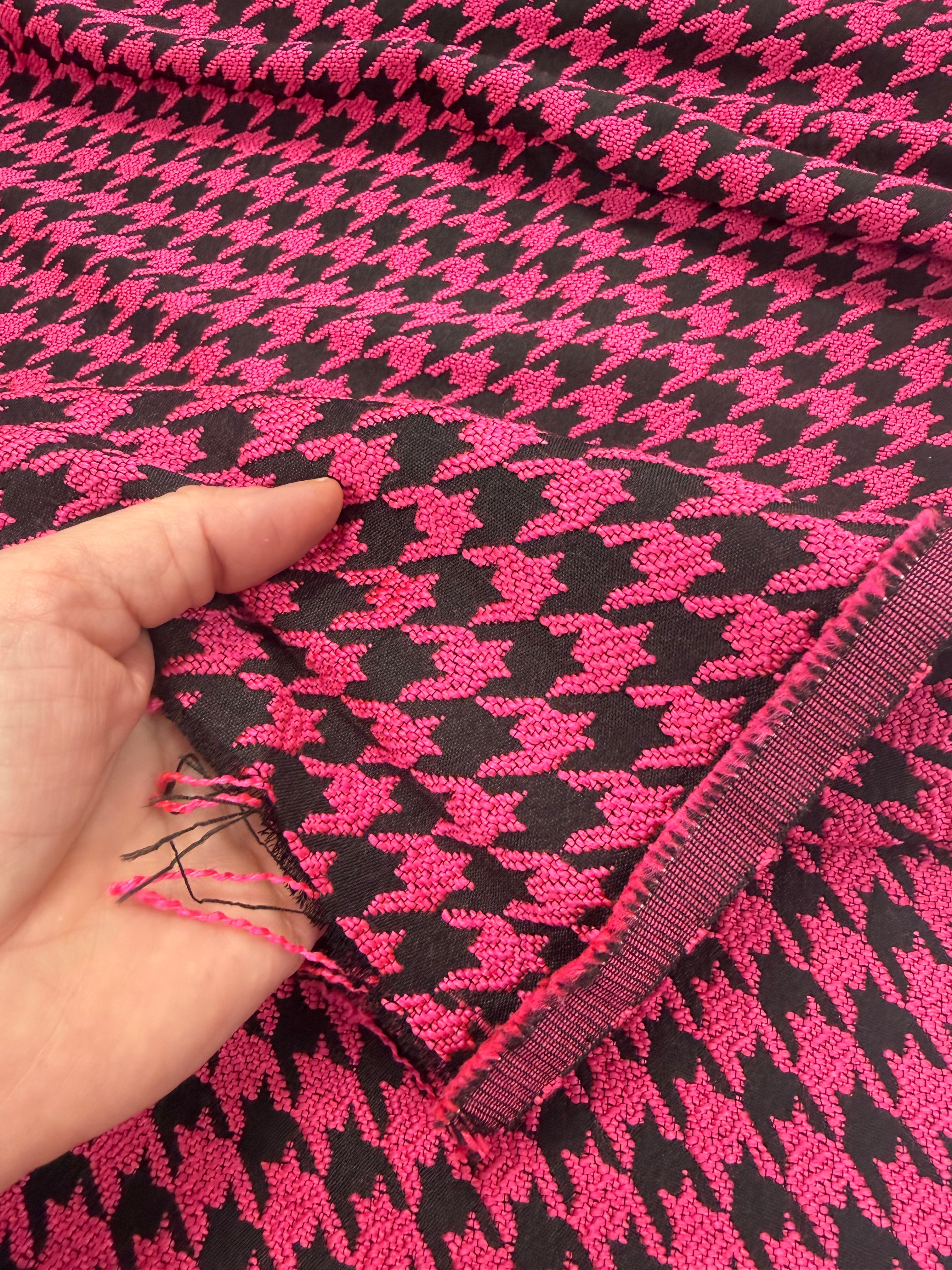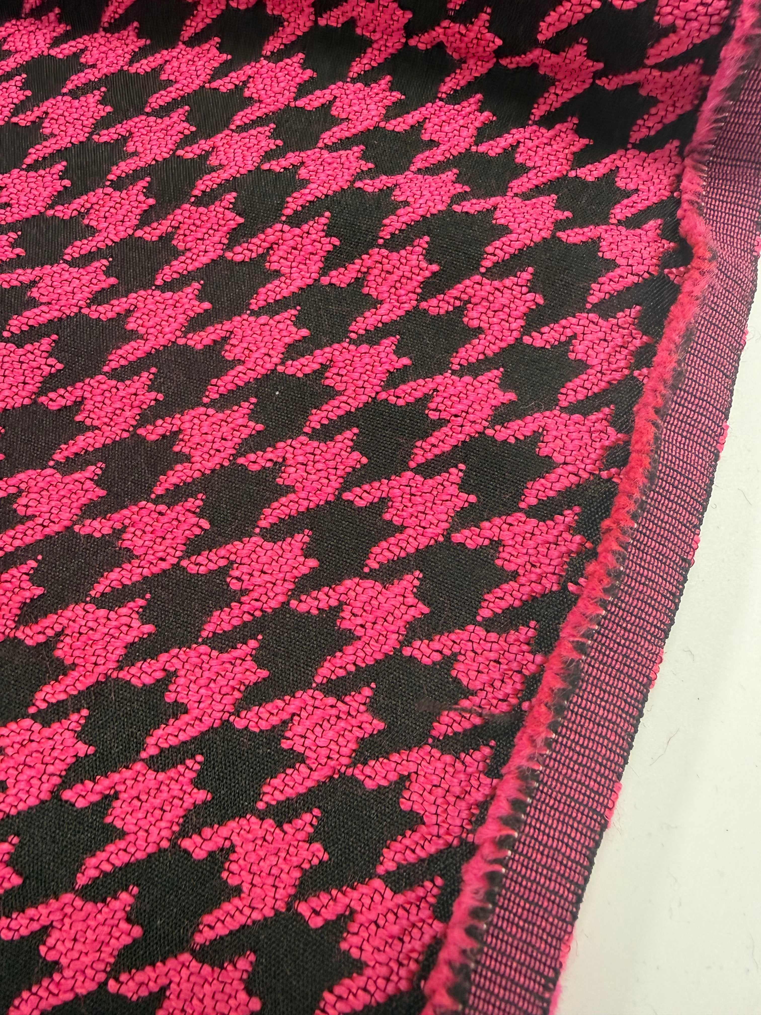 Eye-catching oversized houndstooth in fiery red and vivid pink tones. A dramatic fabric full of personality, great for striking jackets, pinafores, or bold separates.