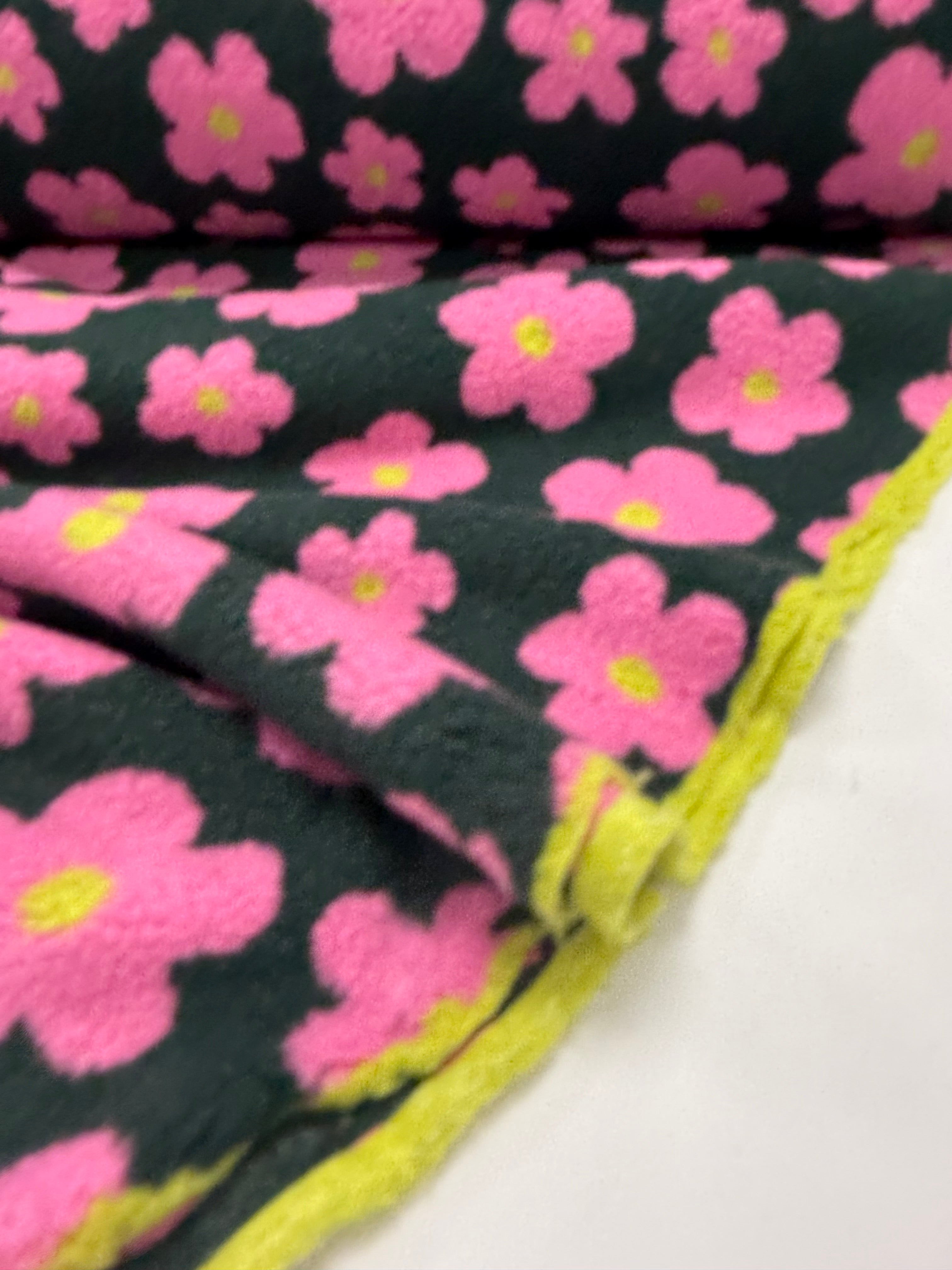 Pink blossoms pop against a forest green background, with a cheerful yellow pops that peeks through for a fun flash of colour. Soft, thick, and irresistibly cozy — it’s a floral dream in fleece form.