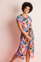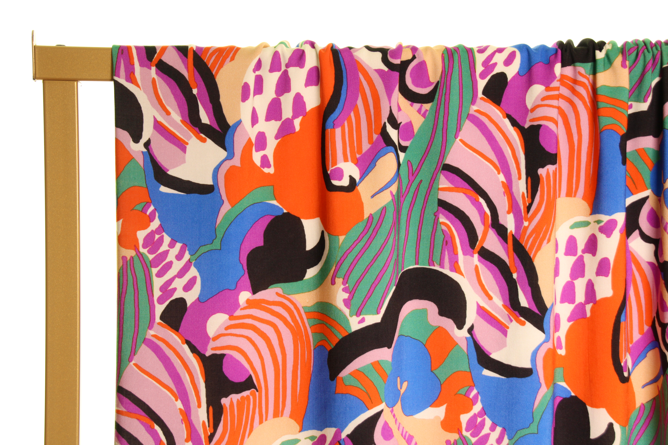 A colourful, artistic and graphic print with tones of blue, orange, green, purple, pink... This fabric is perfect for blouses, dresses, skirts...
