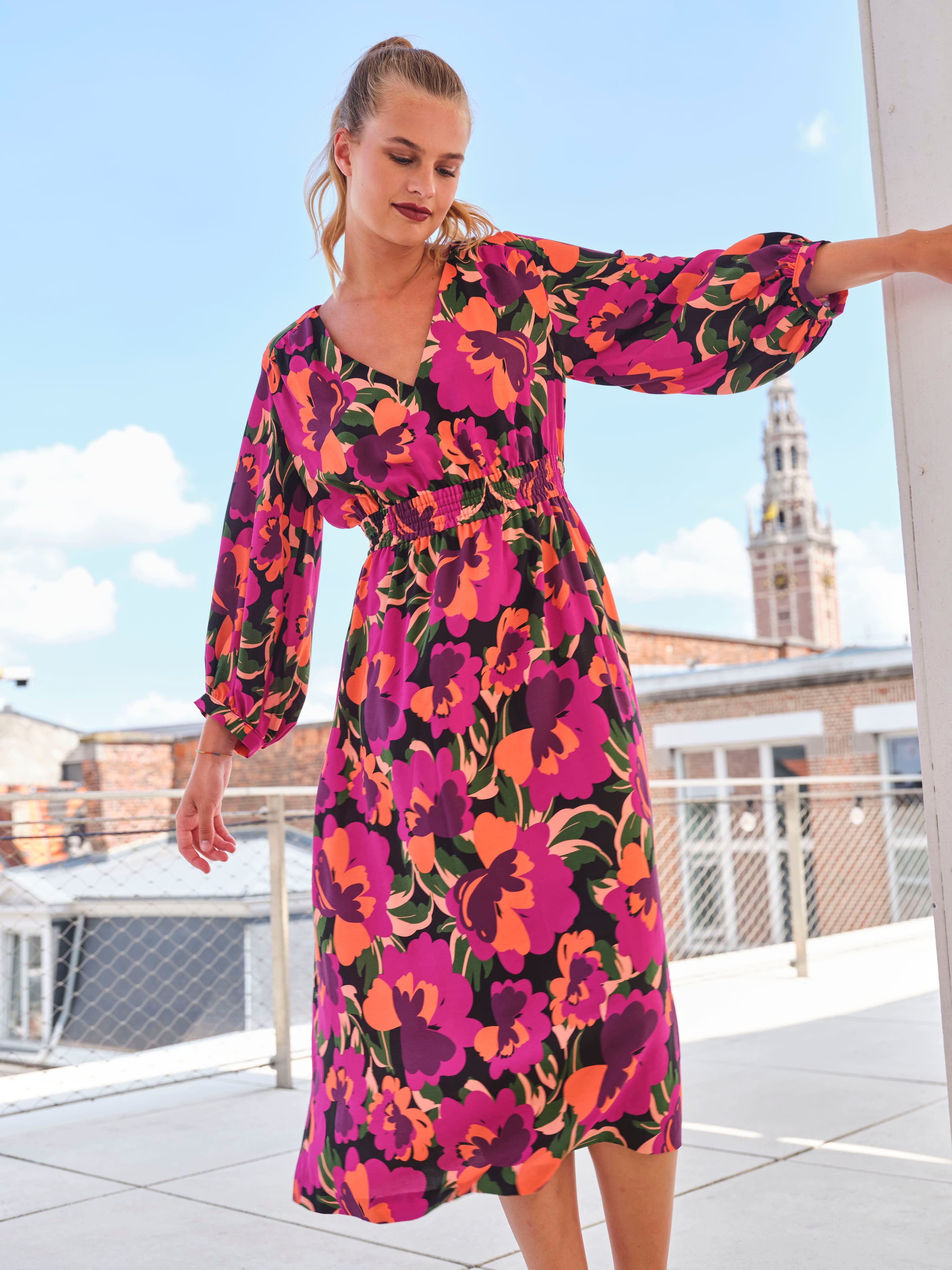 Alana dress is an elegant dress with a V-neckline, wide sleeves and a swirly skirt. There are three options for the waistband: a pleated one, an elasticated one with 3 elastics to get a smock effect, and a flat waistband. The back is always elasticated, so there is no zipper. Alana is best in a viscose or fine cotton.