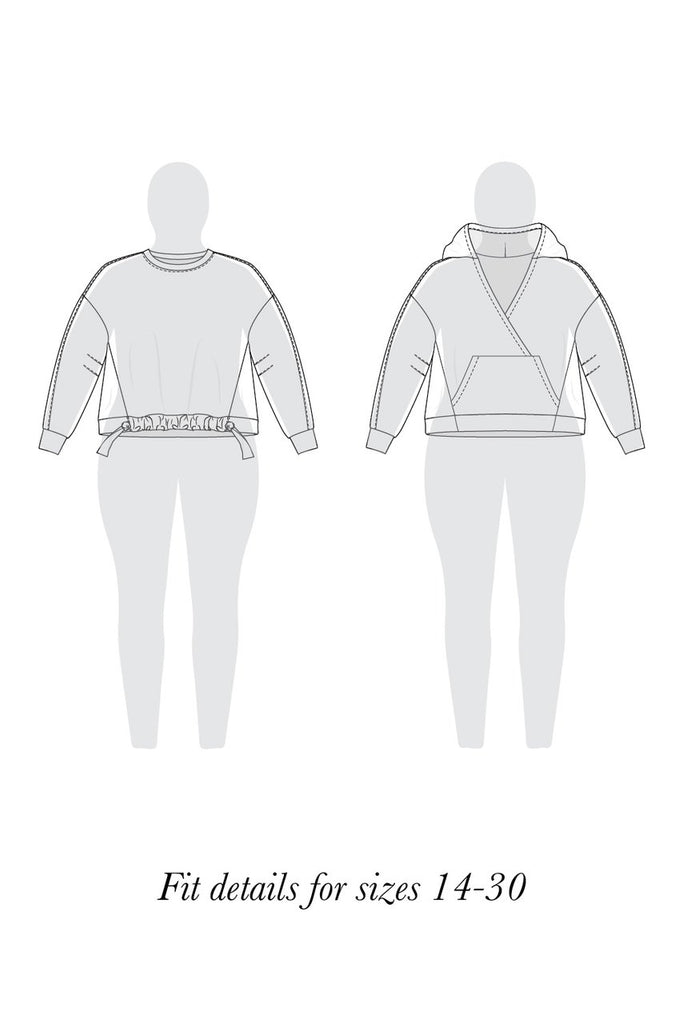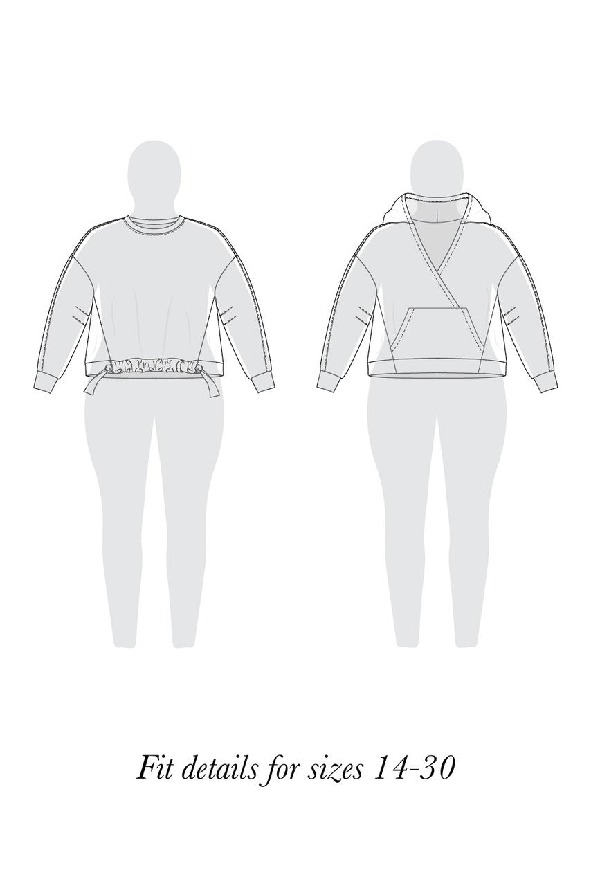 View A is a classic crewneck sweatshirt with a band neckline. View B adds a fun twist by gathering the front band at the waist with a fabric tie. View C is a unique hoodie with a deep crossover neckline and a kangaroo pocket. All views feature a curved back yoke and a two-piece darted sleeve.