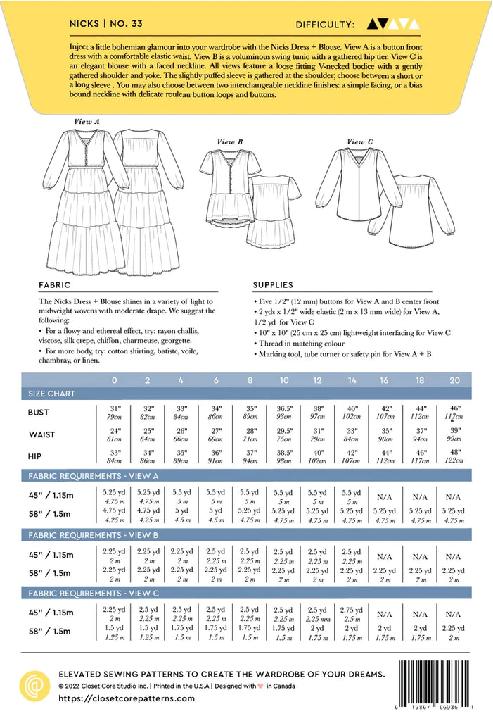 Inject a little bohemian glamour into your wardrobe with the Nicks Dress + Blouse. In multiple variations with soft gathering and delicate details, it's satisfying to make and a pleasure to wear.