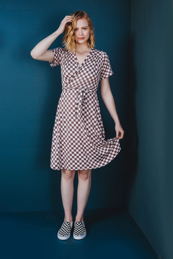 The Westcliff Dress is an easy to sew dress for knit fabrics. It features a wrap front with full coverage and a neckline that won’t gape! There is an optional lower tier that makes this dress a maxi. The pattern also includes a tutorial on how to turn this dress into a cute cropped top.