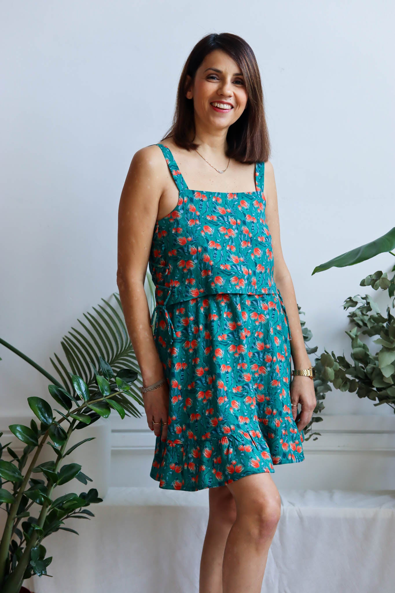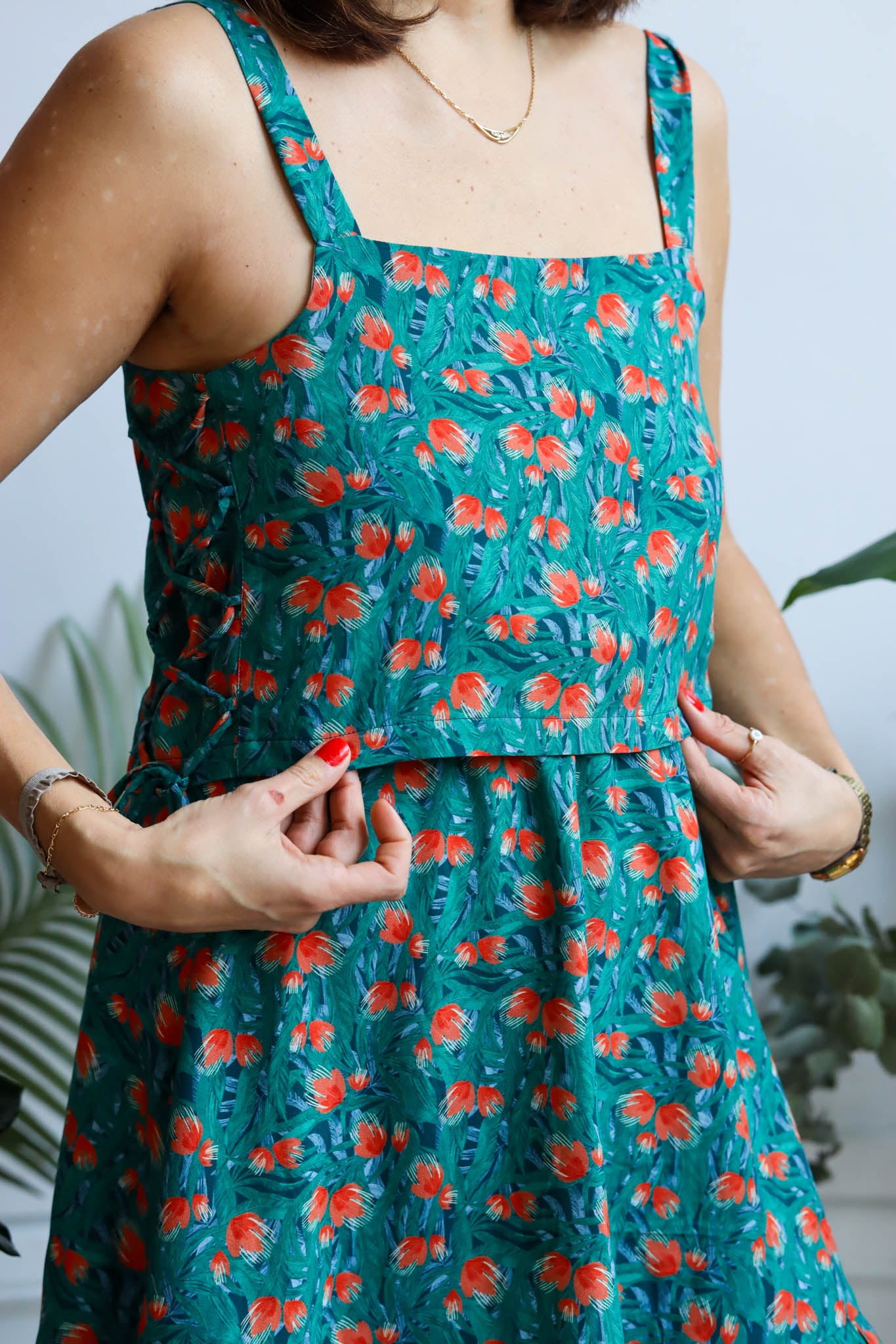 ✂️ SUMMER 2024 COLLECTIONEvergreen where the plant oasis takes on its full meaning! These large leaves with fine lines play on several depths. A strong green reveals a slightly bluish tint in the background. This plant world is reinforced by a deep green as a backdrop. The graphic flowers in orange-red hues bring ardour and break up this monochrome. This unusual plant reminds us of the firebird and its exotic beauty. Its ornamental foliage and astonishing inflorescences are undeniable the tropical beauty of our greenhouse.The graphics of this pattern will lend itself to all your quilts for a unique piece. Combined with our sunset colour, your outfit will become flamboyant.