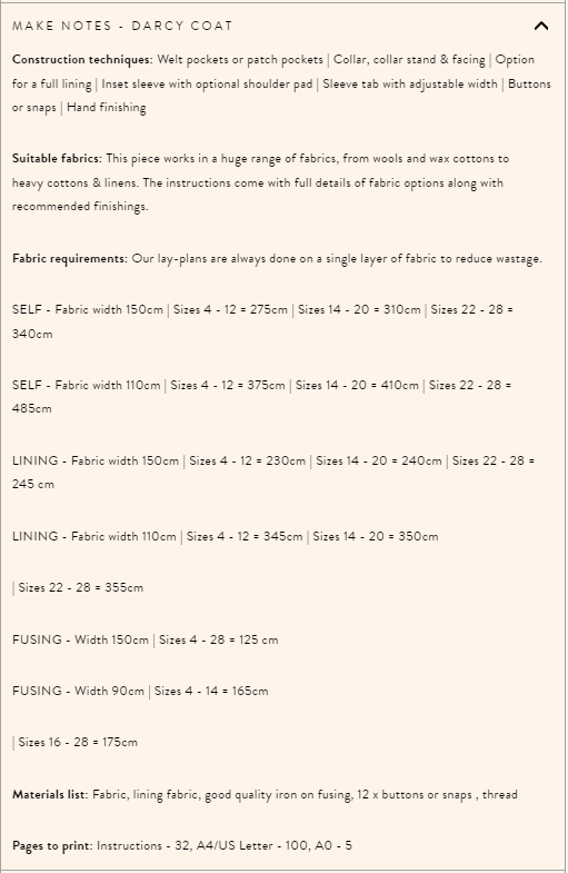 Skill level: Intermediate / advanced sewers (there are design options for first time coat makers and also experienced sewers)