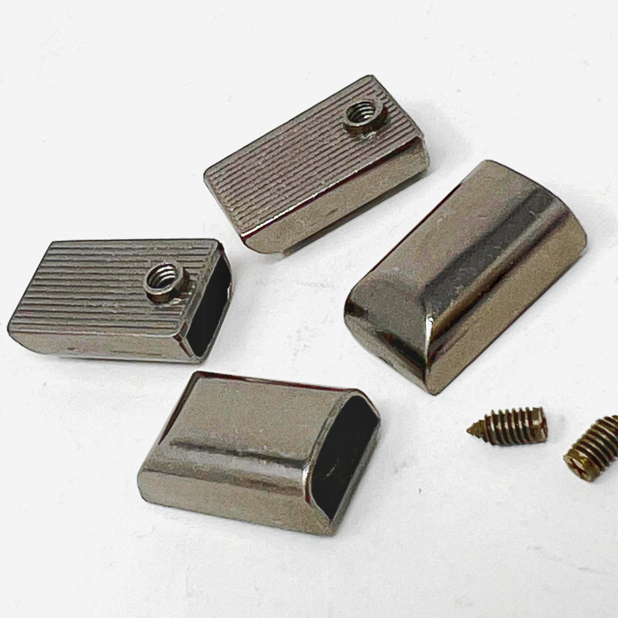 11mm x 7mm. This handy metal block is a great way to tidy up the raw end of your zip. Simply push the end of your zip into the block, tighten the screw & that’s it done.