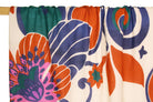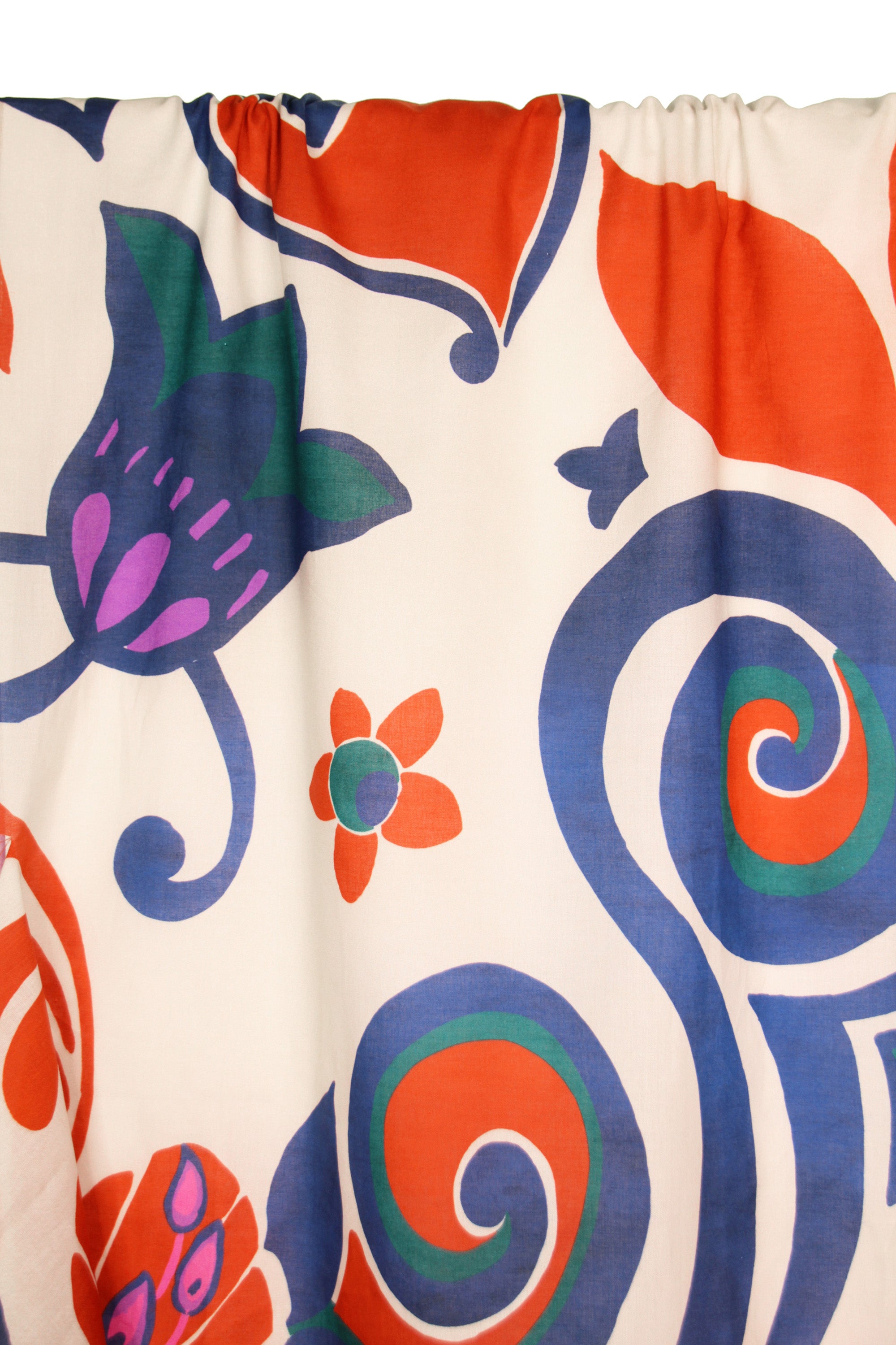 A lightweight cotton with a soft grey base and a print of a large flower and some abstract leaves. Colours are brick red, green, blue and pink. The diameter of the large flower is 35 cm. This fabric is perfect for blouses, dresses, skirts...