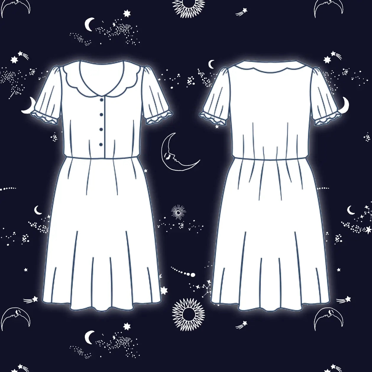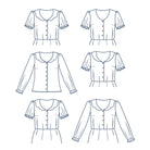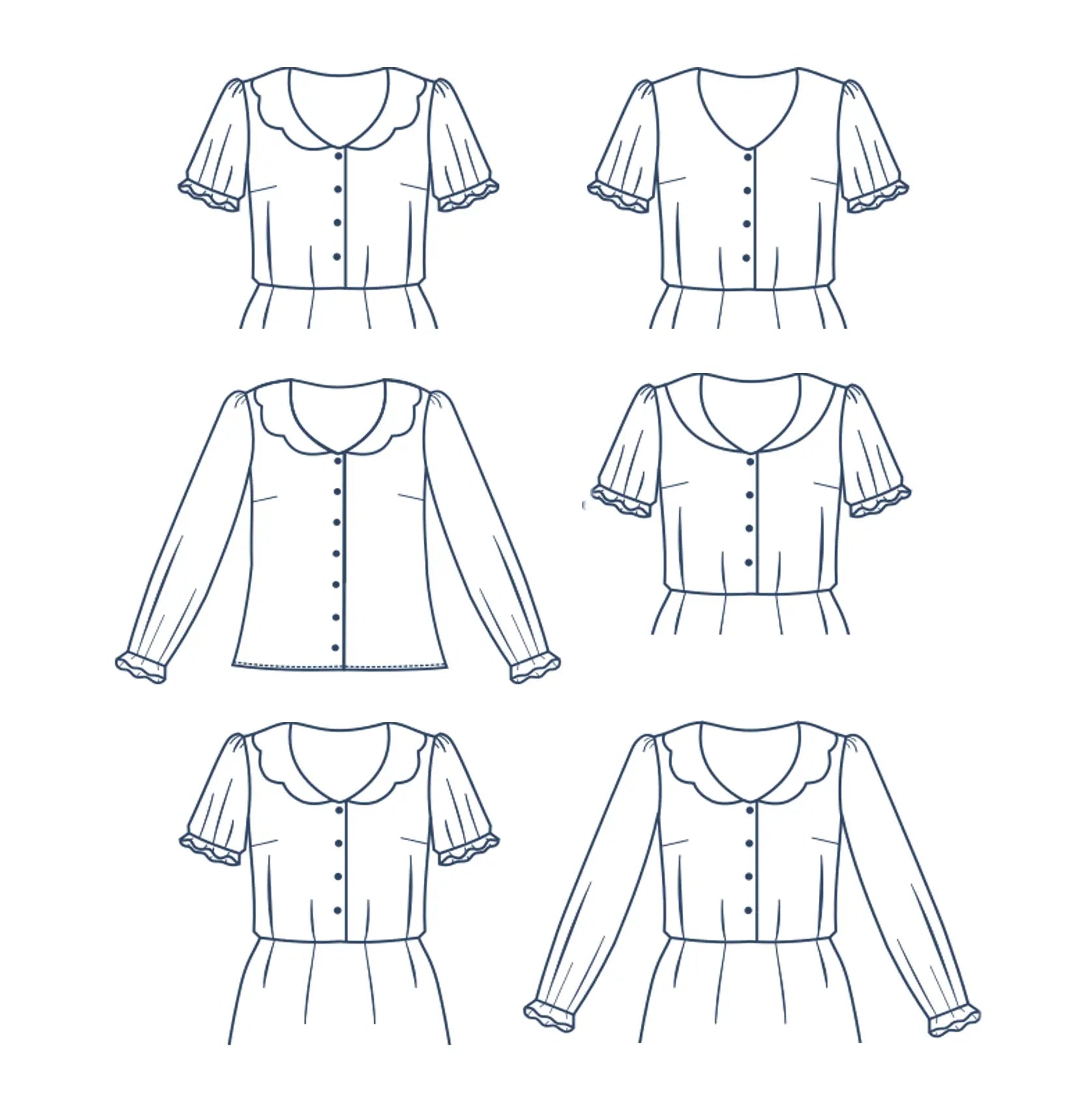 Buttoned on the front, elasticated at the waist and with a scalloped collar, the pattern offers 2 versions of sleeves as well as a blouse version.