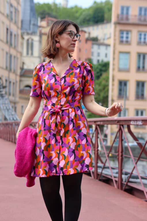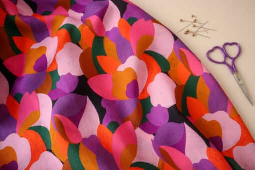 🔎 Fairytale is our abstract pattern for the fall season. Its powerful and luminous colors createthe link between eras. Our super pink with a modern air comes together with a few hints of a retro honey. It makes us travel between the real and the magical: a dreamlike world in whichpretty rounded shapes come to reproduce large flower petals to form an entire flower bed. Fairytale makes us fly and vibrate along its curves. A strong pattern to sew in a long dress to assert your style or in a little touch version skirt or top to match it with another plain piece preferably. The vibrancy of the colors can becounterbalanced by notes of chestnuts and honey present on the fabric.