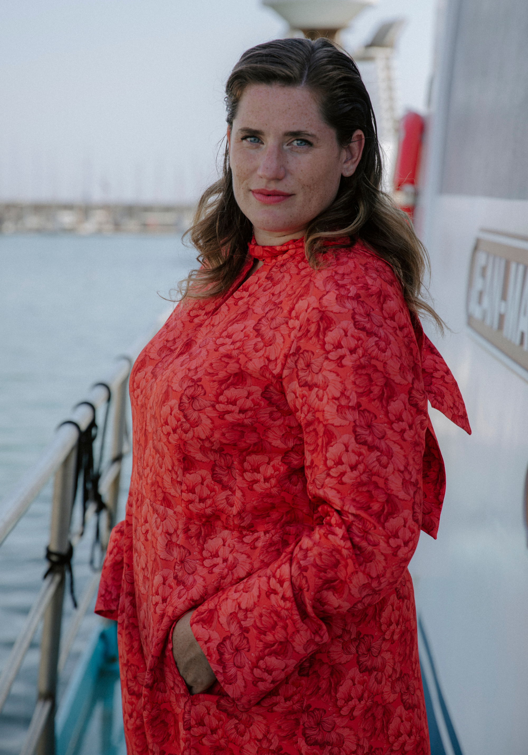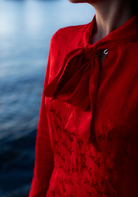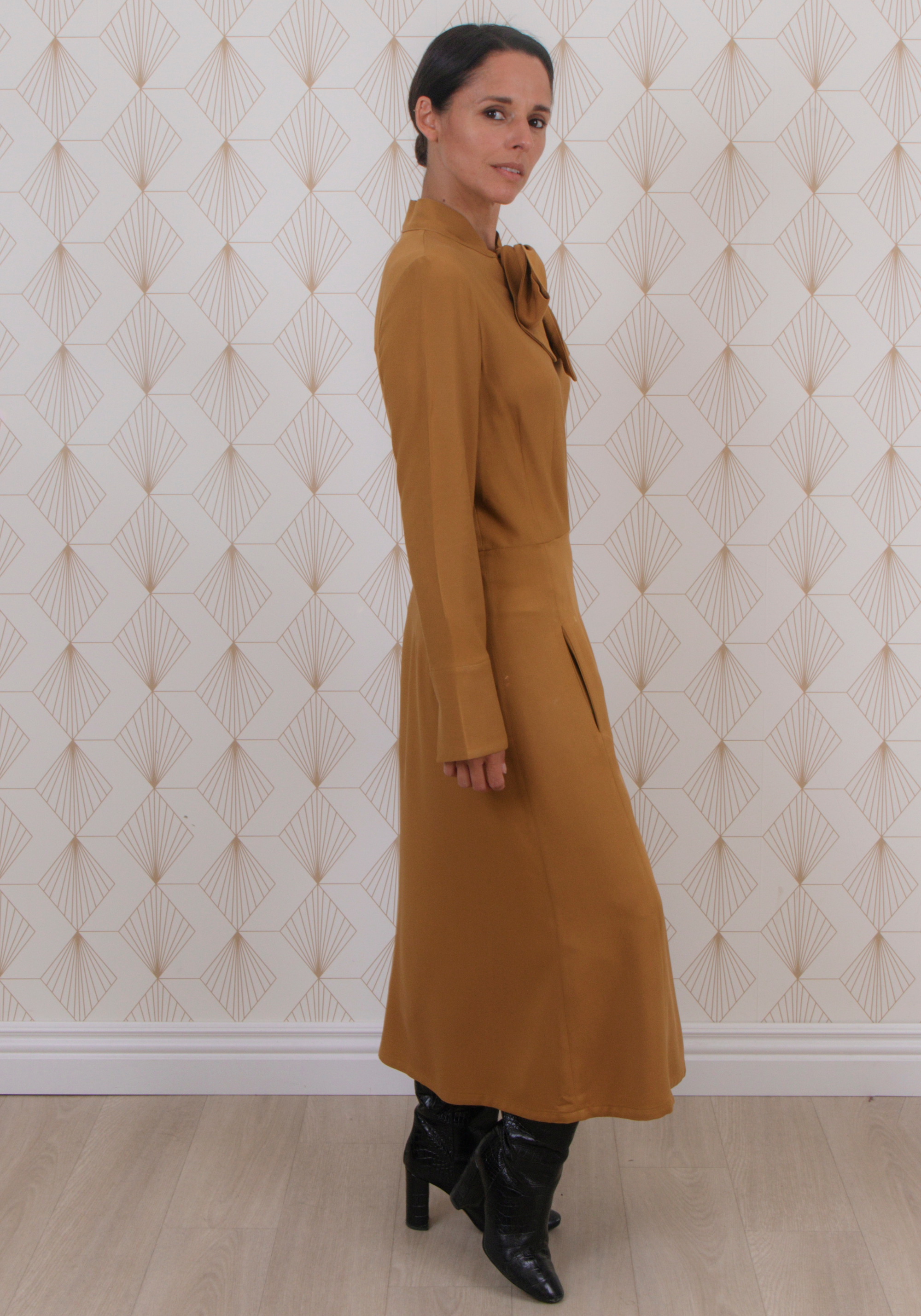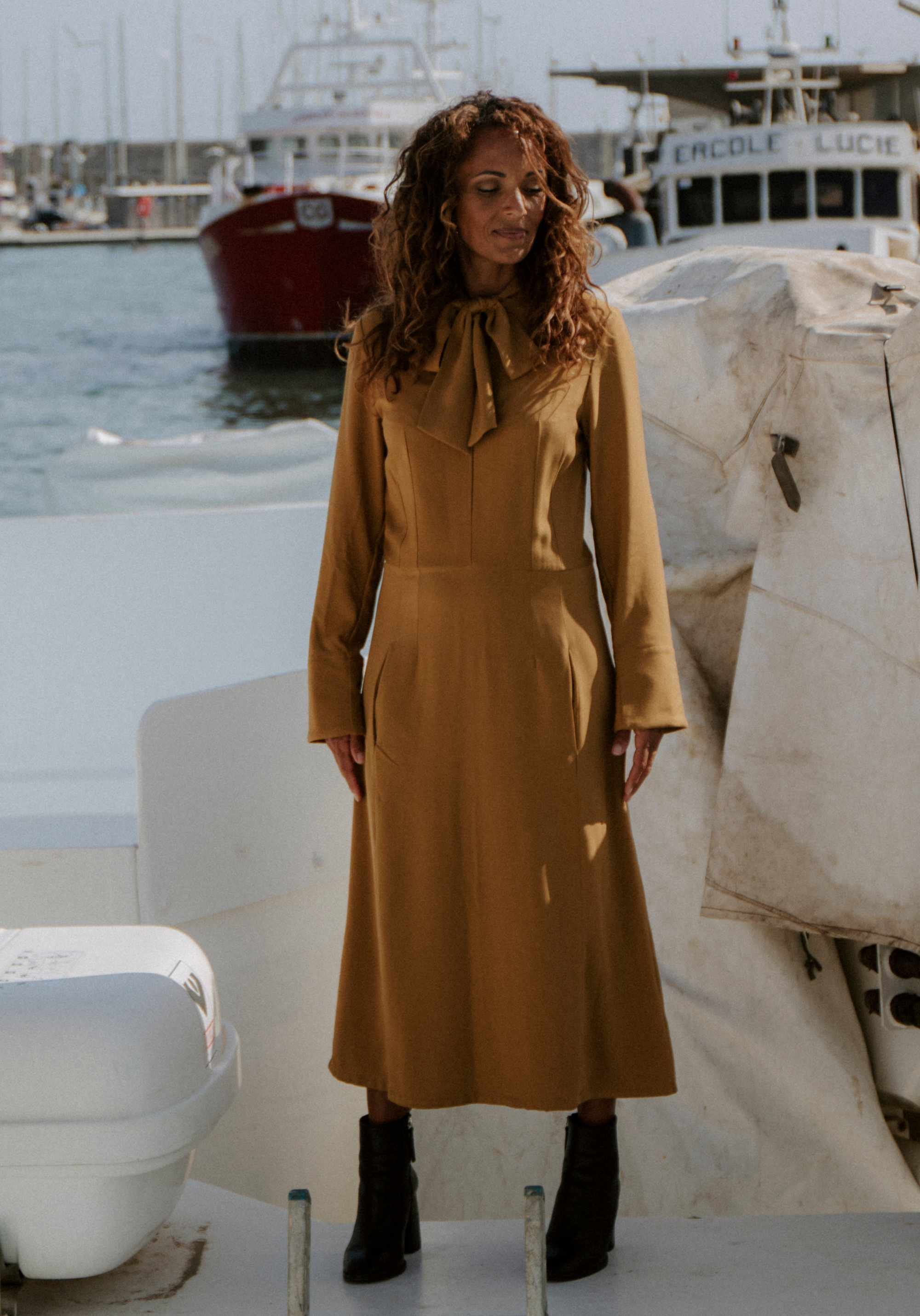 The PENINSULE dress is the most elegant dress in the Le Rivage collection: its below-the-knee length is very feminine, its pussy-bow collar emphasises the front, its lightly fitted shape is constructed with darts that elongate the silhouette, and its cut-outs conceal pockets.