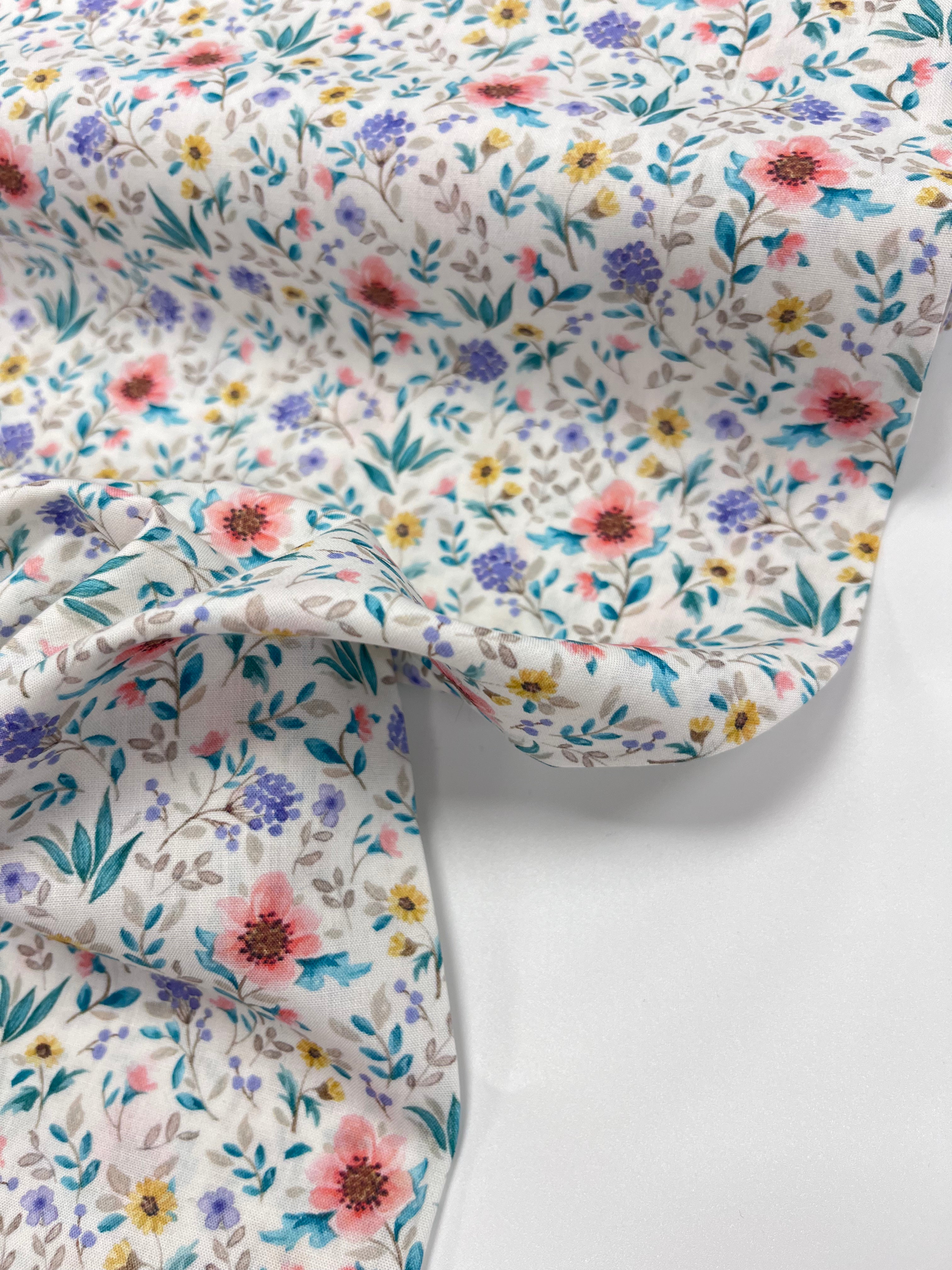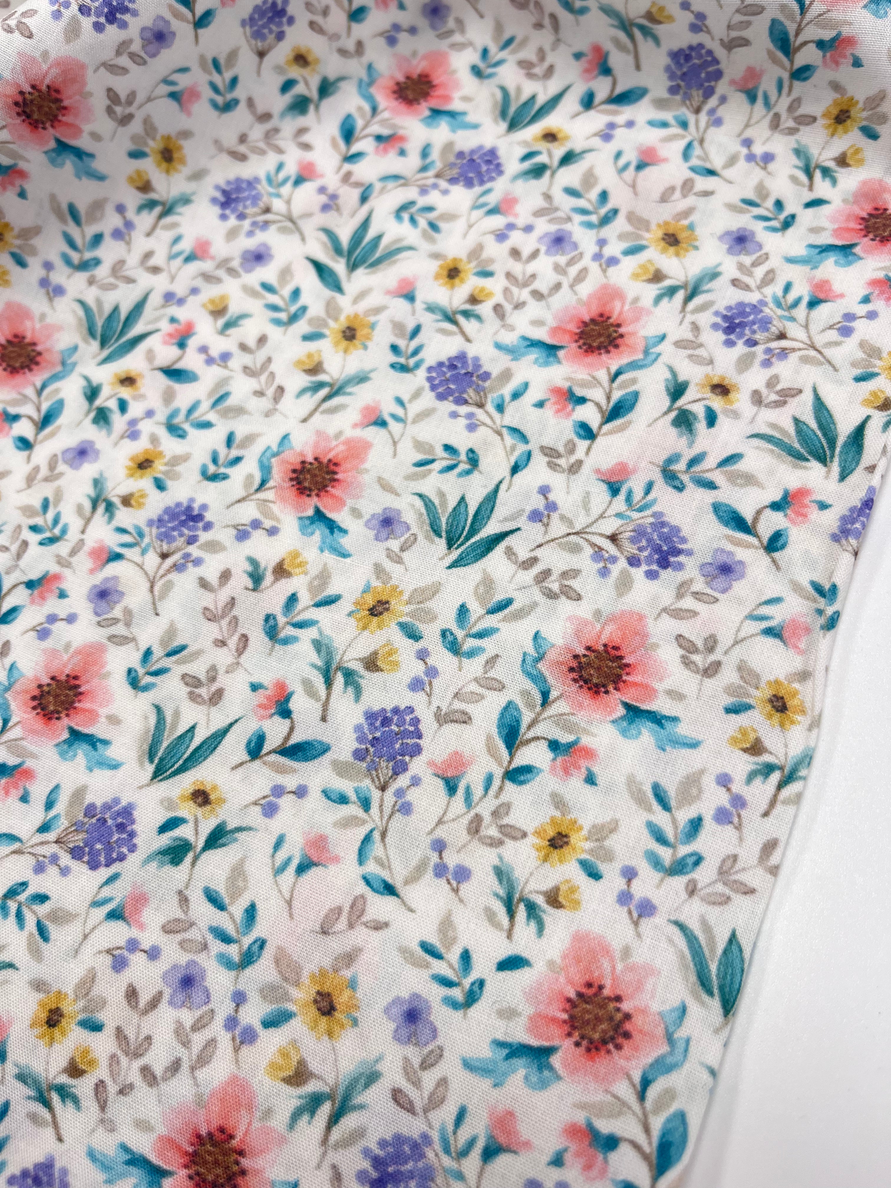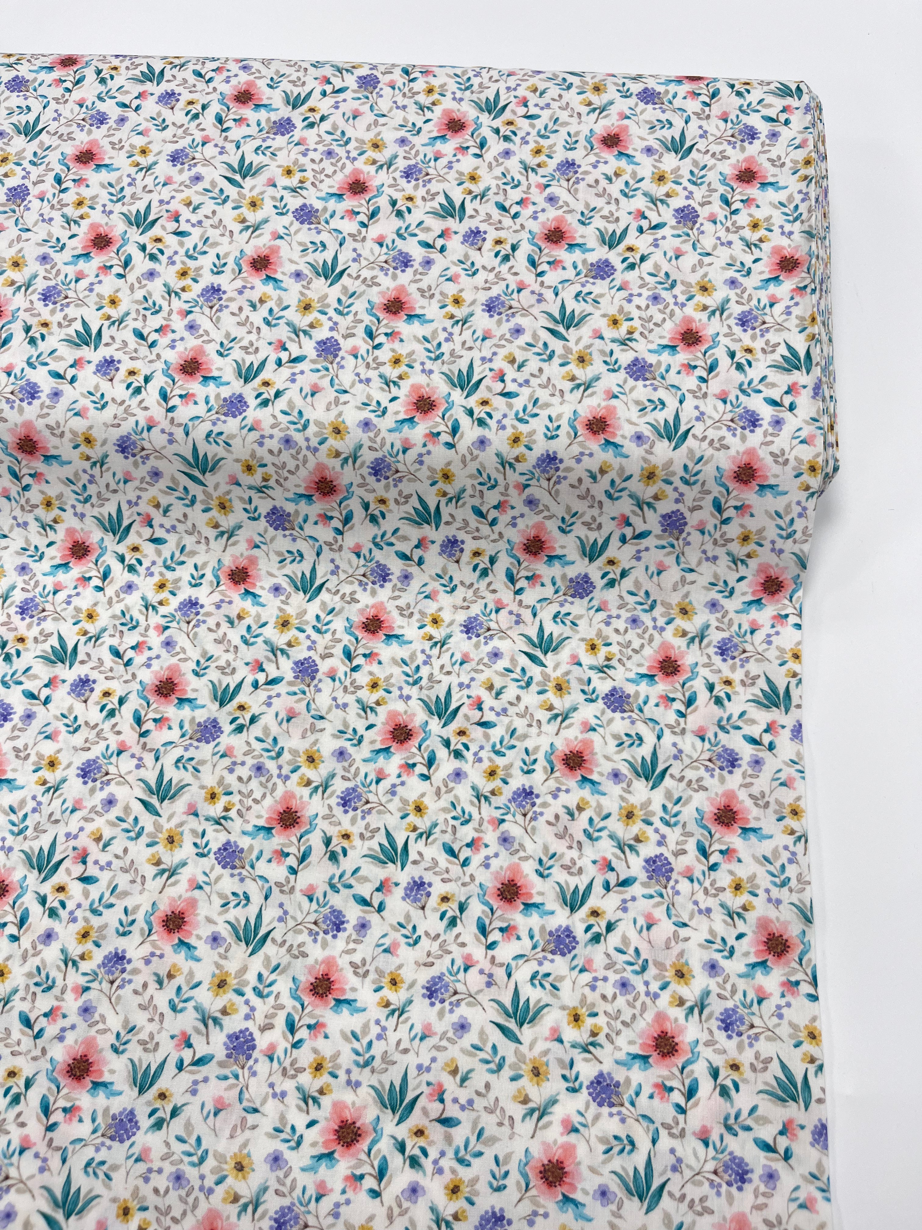 Meadow An all-over meadow of wildflowers scattered across a soft off-white base. Featuring pink blossoms, golden daisies, purple sprigs, and leafy greens, this fresh and versatile print works beautifully with its matching Trellis – Off White.