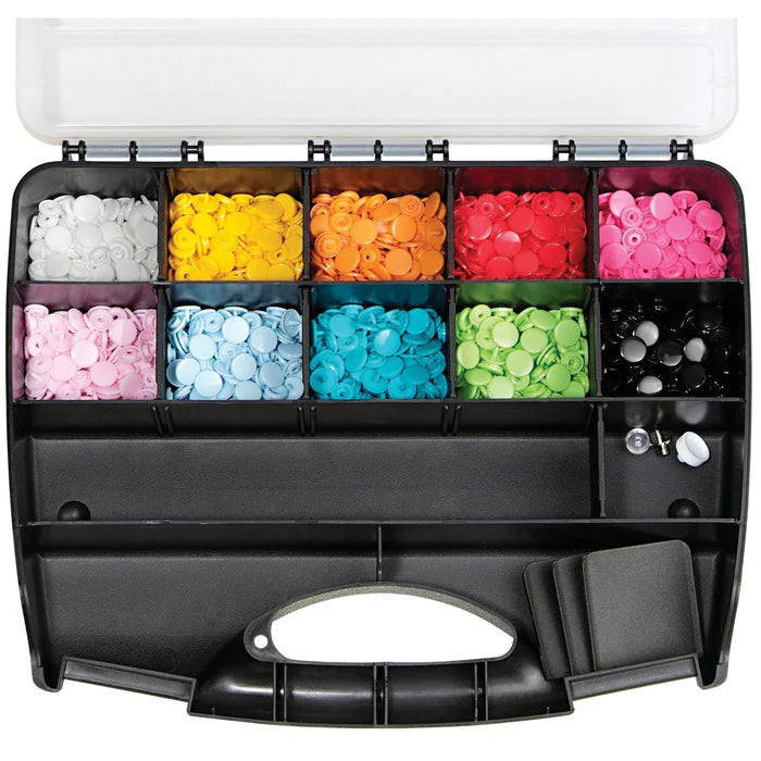 This practical and convenient storage box comes supplied ready filled with 300 Prym Colour Snaps, that's 30 each of the following 10 colours: white, yellow, orange, red, pink, light blue, turquoise, apple green and black.