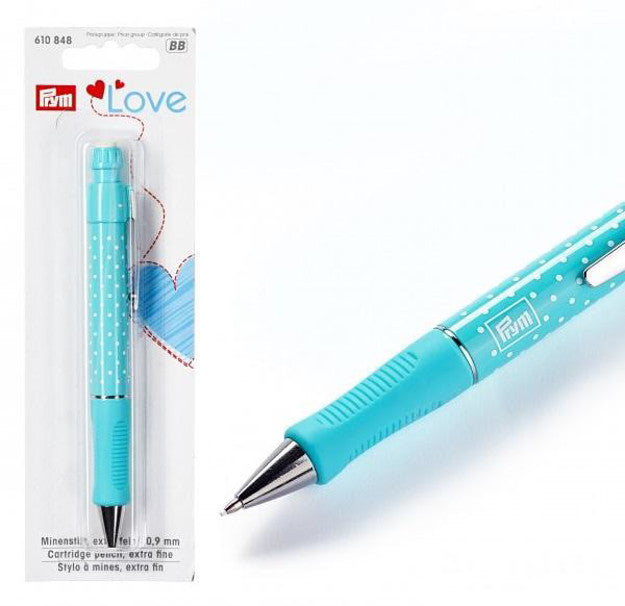 This exclusive Prym Love Cartridge Pencil is great for marking seams and patchwork. In particular, relatively fine and accurate work with stencils can be mastered with this marking pen. It is shaped to sit comfortably in the hand and it's fine white tip guarantees accurate tracing of markings and pattens onto light-coloured and dark fabrics. There is an eraser cartridge on the upper end of the pen to remove markings. When washed, the markings disappear completely.