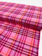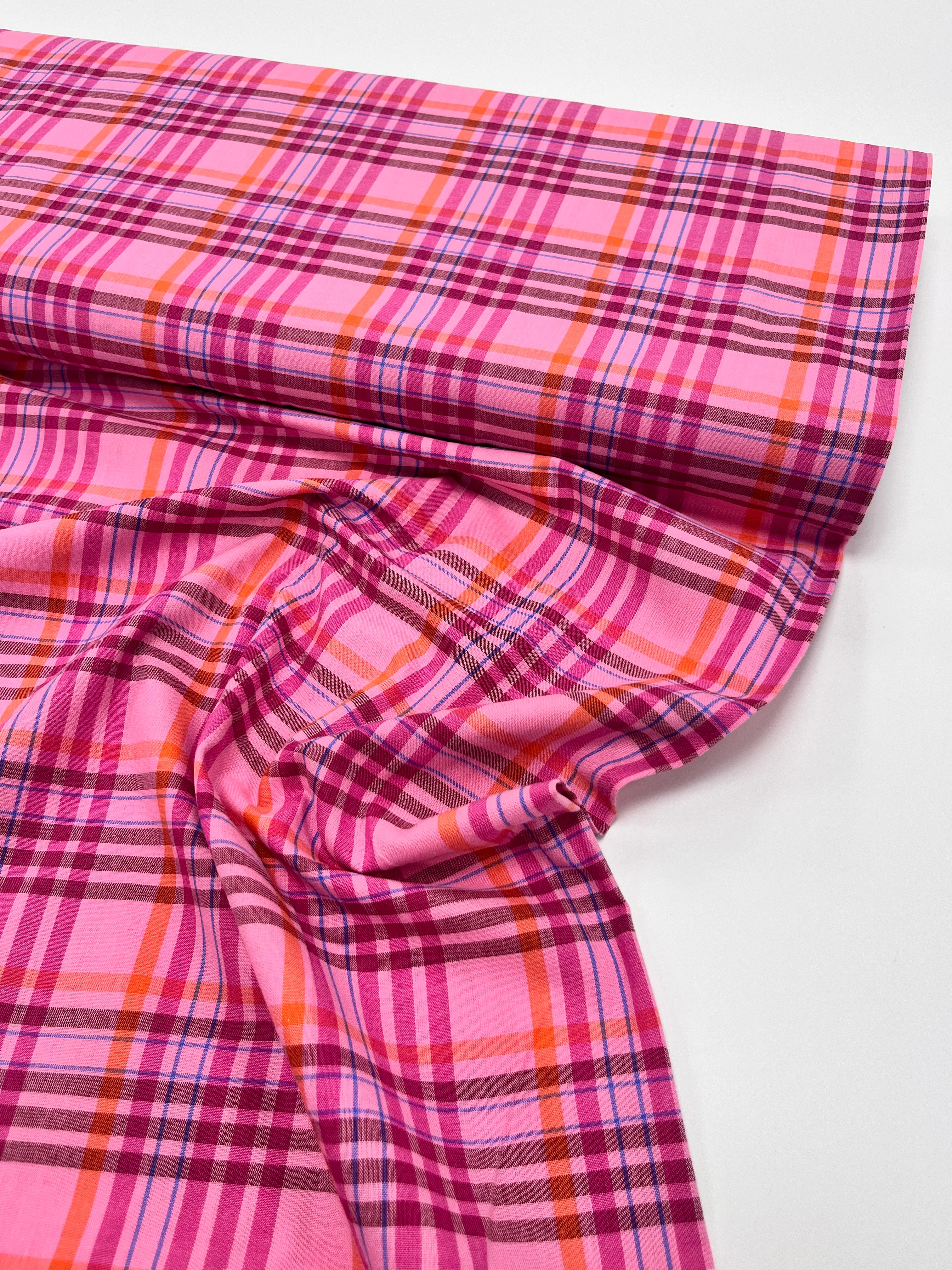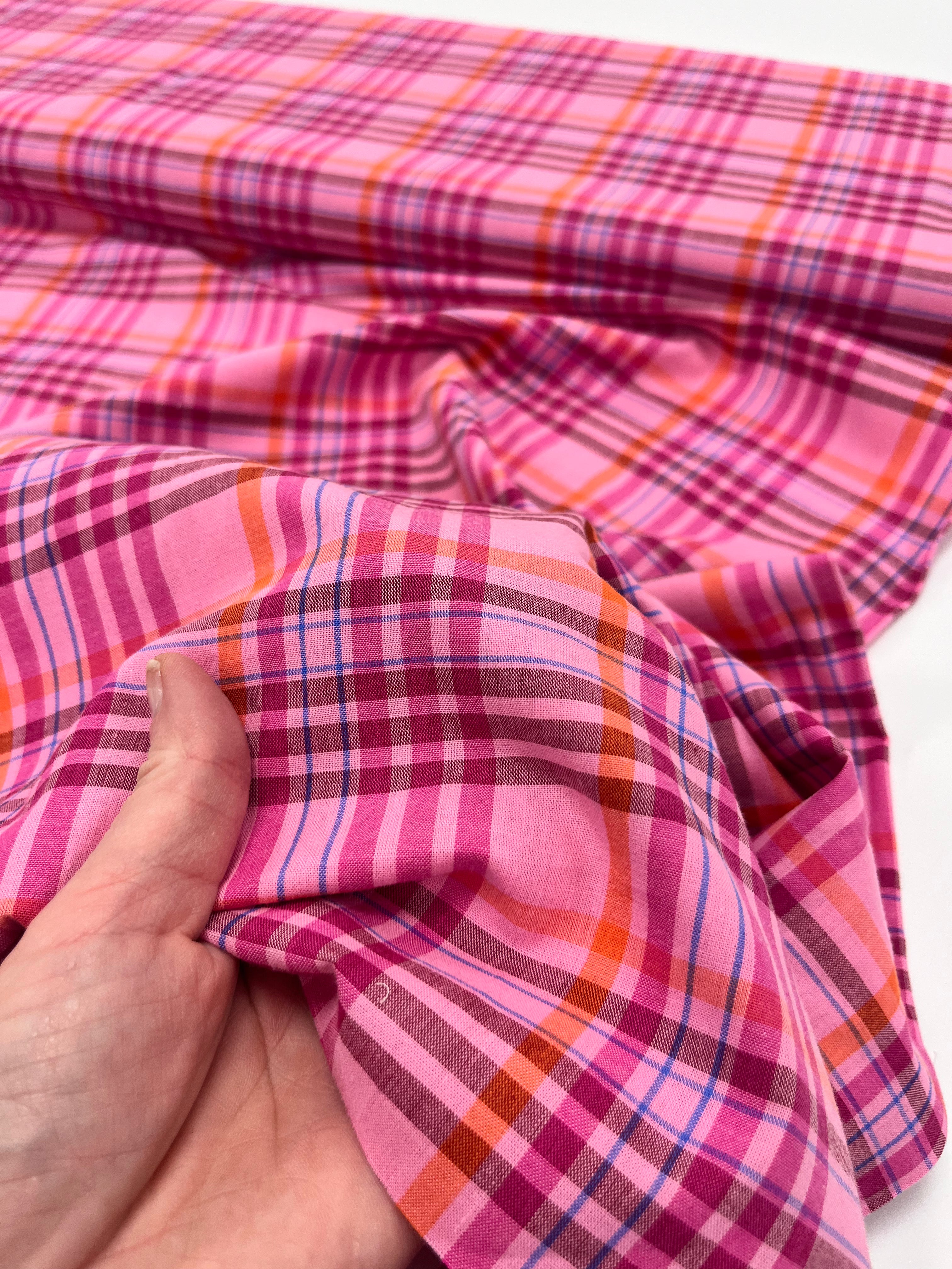 This is a lovely cotton blend seersucker fabric check of pink, rose, orange and blue . It is a light/medium weight fabric with a nice drape. It would make gorgeous tops with statement sleeves or gathered skirts