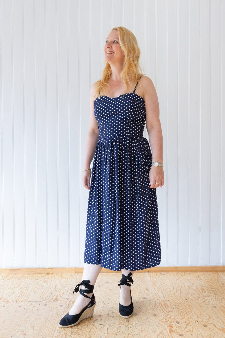 Summer in London is a beautiful dress with a distinctly vintage feel. Princess seams are used to give a lovely fitted shape to the bodice which is fully lined, whilst gathering provides fullness to the elegant midi length skirt. Fastened at the back with a concealed zip and with the option of making the rouleaux straps adjustable, there are plenty of techniques for sewers to sink their teeth into.