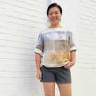 Whisper blouse sewing pattern, sewing pattern, is an uncomplicated, relaxed-fitting garment designed for Double Gauze fabric. Choose either the boat neckline or the round neckline with a button placket. Make either a blouse or a dress, and Choose the straight sleeve in 7/8, 3/4, or elbow length, or the fuller sleeve with a sleeve tab.