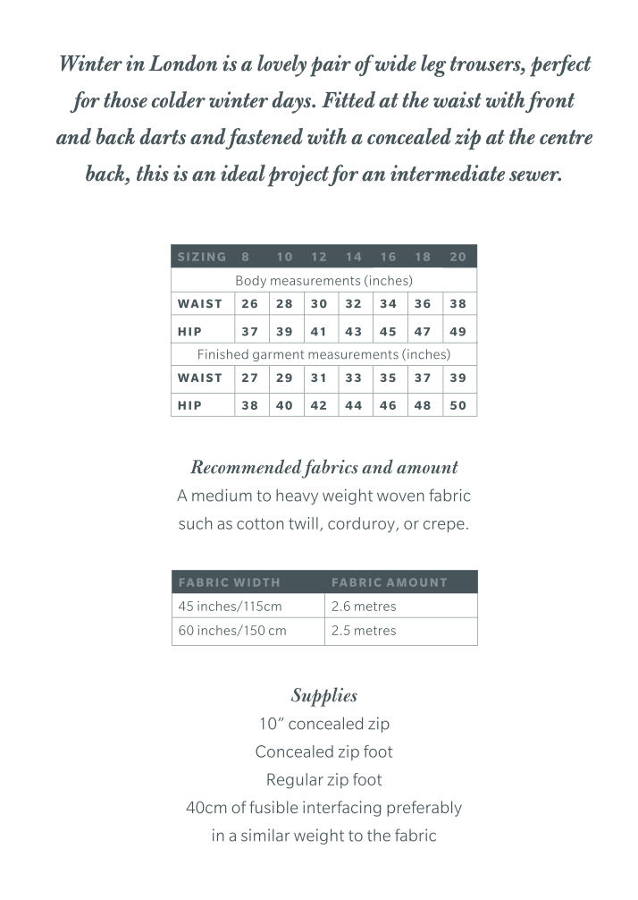 Winter in London is a flattering pair of wide leg trousers which have a classic yet relaxed vibe. Designed to flatter the natural feminine figure, the trousers sit comfortably on the waist whilst the loose wide leg gives a lovely laid back feel. With front and back darts adding shaping at the waist, a concealed zip securing the trousers at the centre back and a facing finishing the trousers neatly at the waist, these can be sewn with the minimum of fuss.